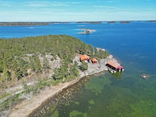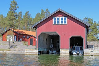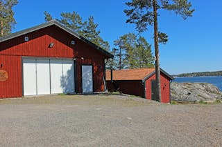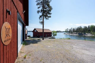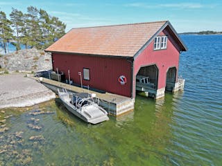 Ett vackert båthus med trästomme och tegeltak, uppfört 2004, är perfekt beläget vid havet. Med en byggnadsyta på 14 x 12 meter inklusive bryggor erbjuder det två rymliga båtplatser och därtill två vidbyggda bryggor. Dessutom har båthuset en rymlig övervåning som lämpar sig väl som förråd eller för trevliga tillställningar med vänner, som en kräftskiva efter en dagssegling till havs. El är också indraget till övervåningen.
