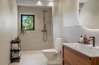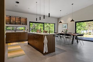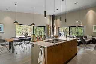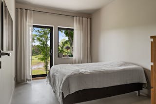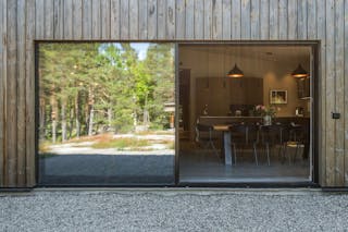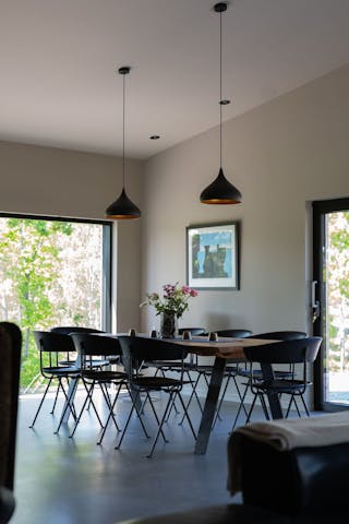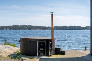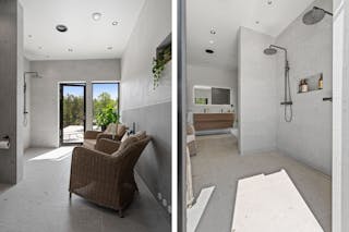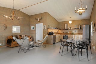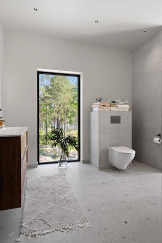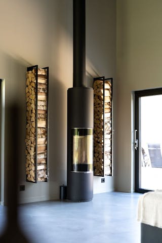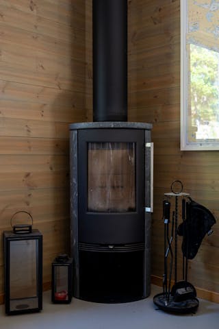 Badrum och WC är inredda med möbler från Haven i valnöt, skapande en oas för avkoppling och välbefinnande. När kvällskylan faller in, kan du värma dig vid den svarta danska kaminen från Rais Pilar, närmare två meter hög, som förenas med extra värmelagrande stenar för att maximera värmeutbytet.