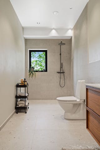 Denna exklusiva bostad har inte lämnat något åt slumpen. Färgsättning och designval har omsorgsfullt utförts av professionella designers. Njut av de genomgående slipade betonggolven HTC som ger ett stilrent och industriellt intryck, och låt dig förtrollas av det italienska kakel och klinker som adderar en känsla av världsvana.