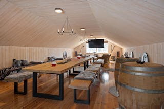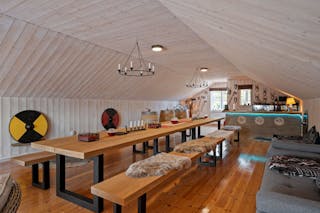 Här finns även ett båthus med två båtplatser samt en elegant övervåning, perfekt för middagar och sociala tillställningar. Byggnaden är omsorgsfullt designad för att erbjuda både funktion och estetik. Vidare finns en maskinhall med generösa förvaringsutrymmen och bekvämligheter som duschrum och ett pentry för att göra vistelsen så bekväm som möjligt.