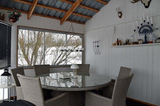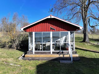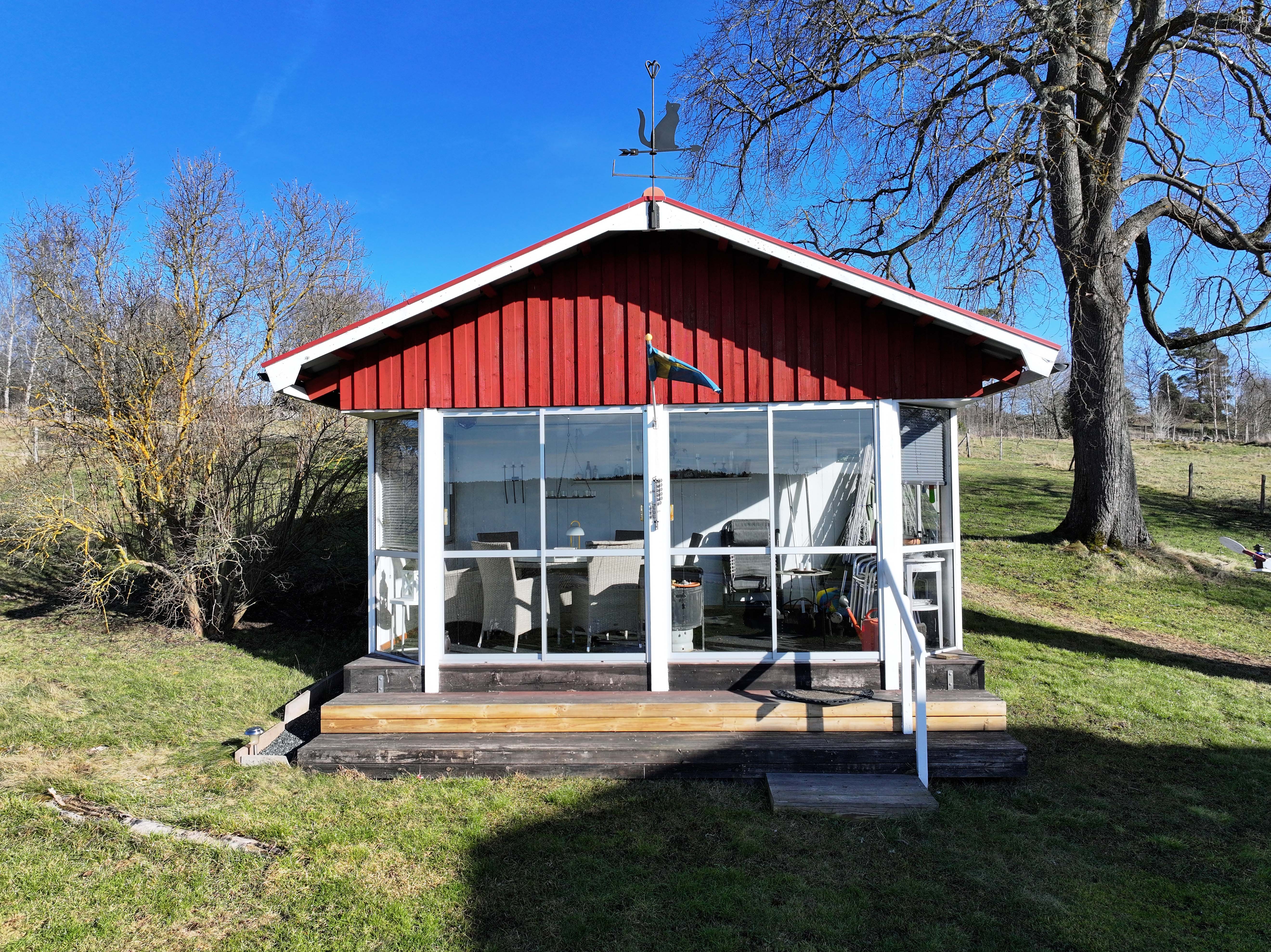 Vid sidan av huset ligger vedboden och framför vedboden finns en tillbyggd inglasat uterum.
