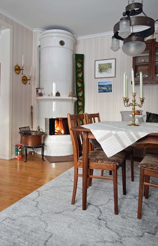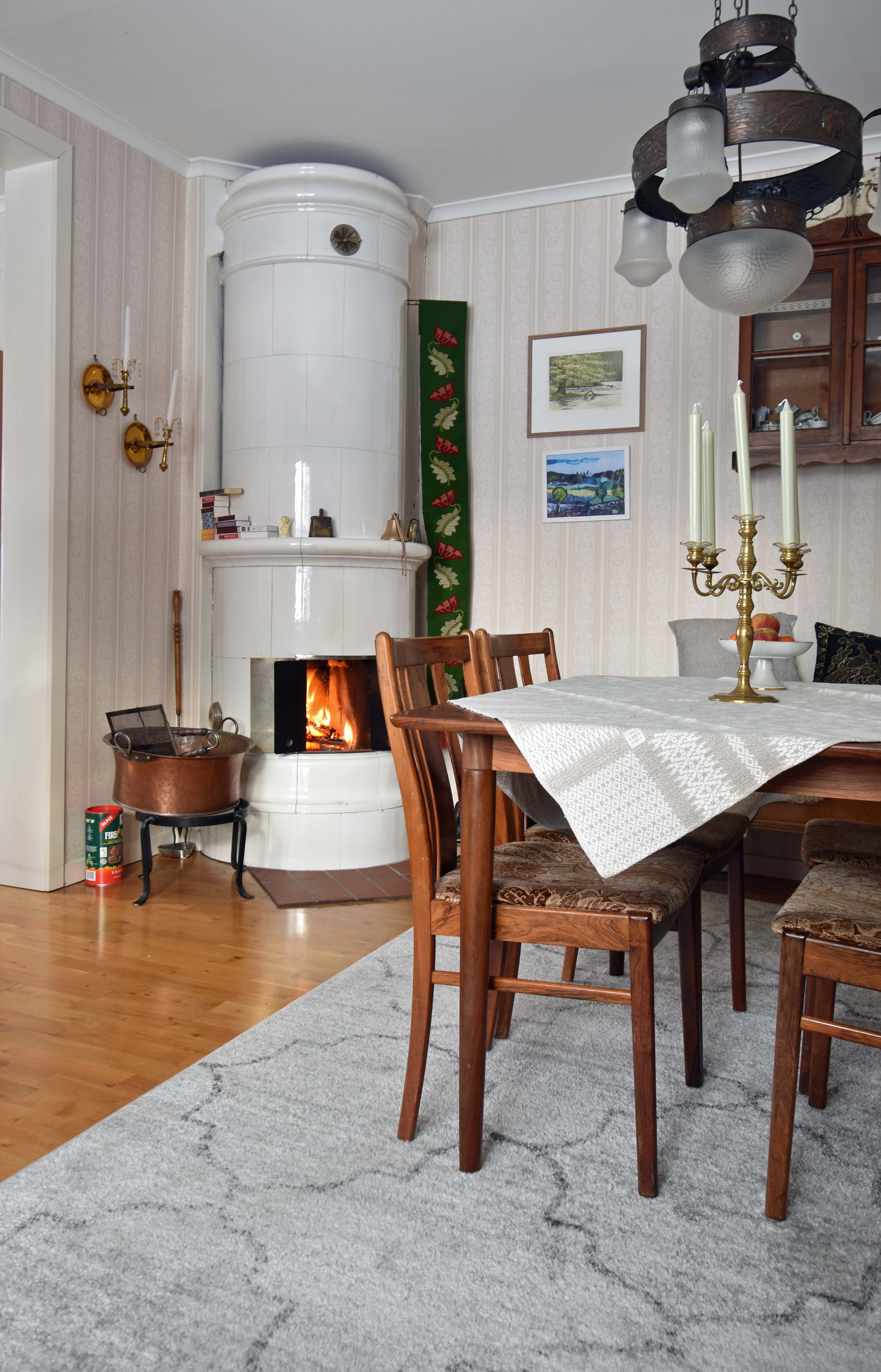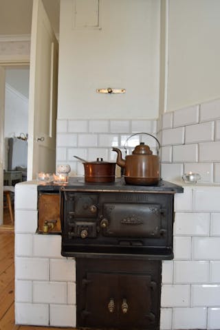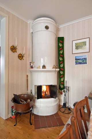 Uppvärmning med vedpanna Diom från 1995 och 2 ackumulatortankar om 500 liter vardera samt elpatron.