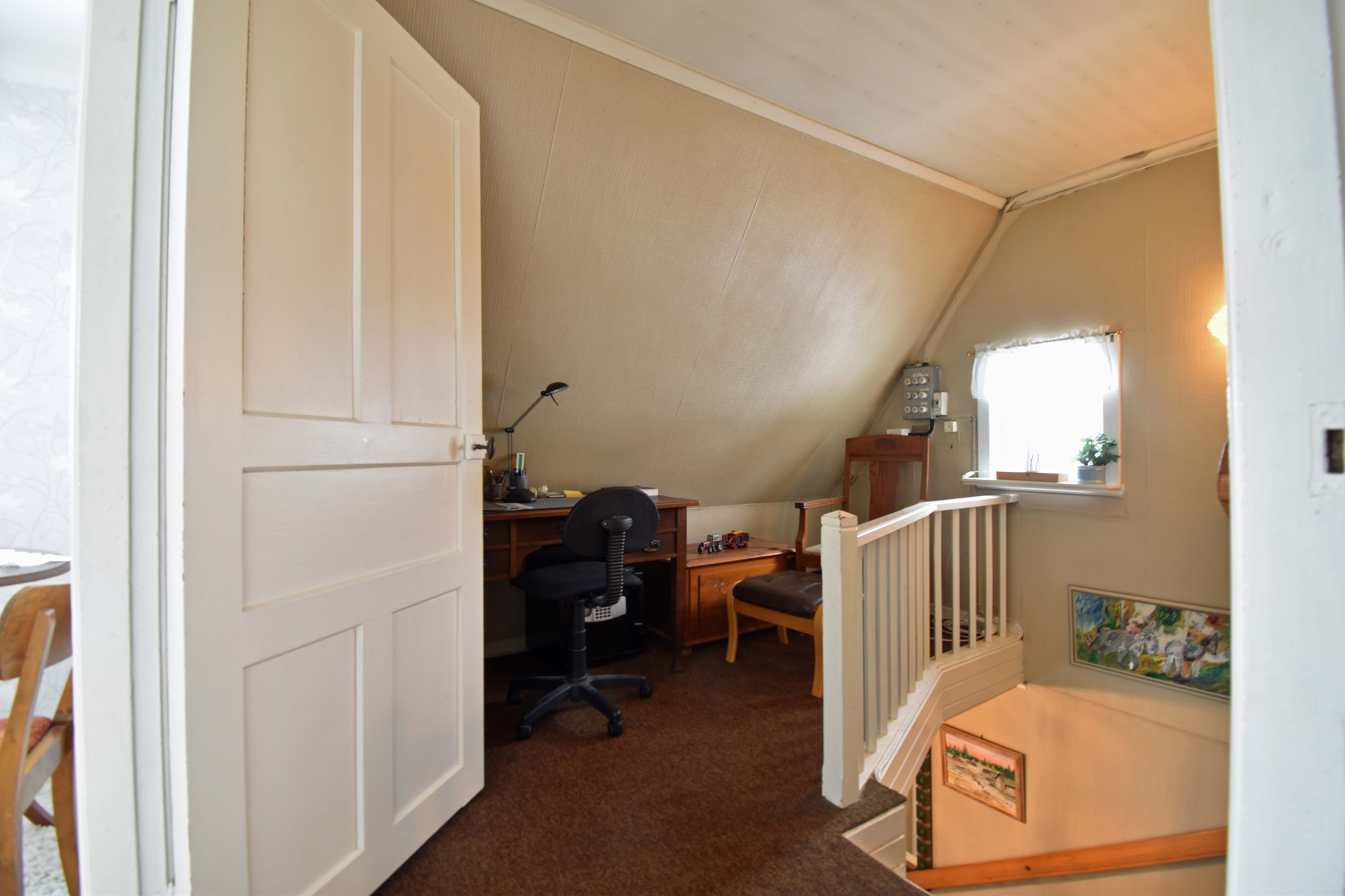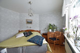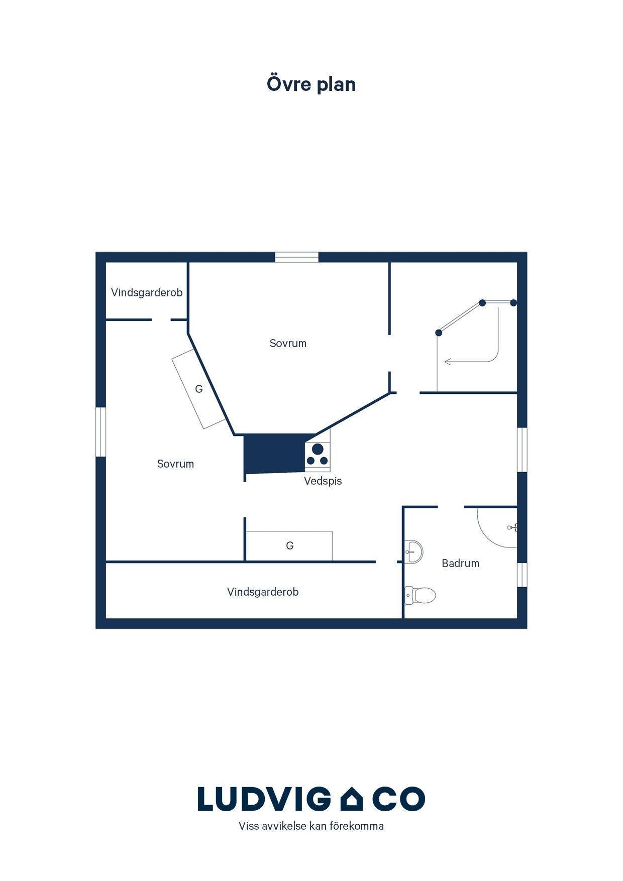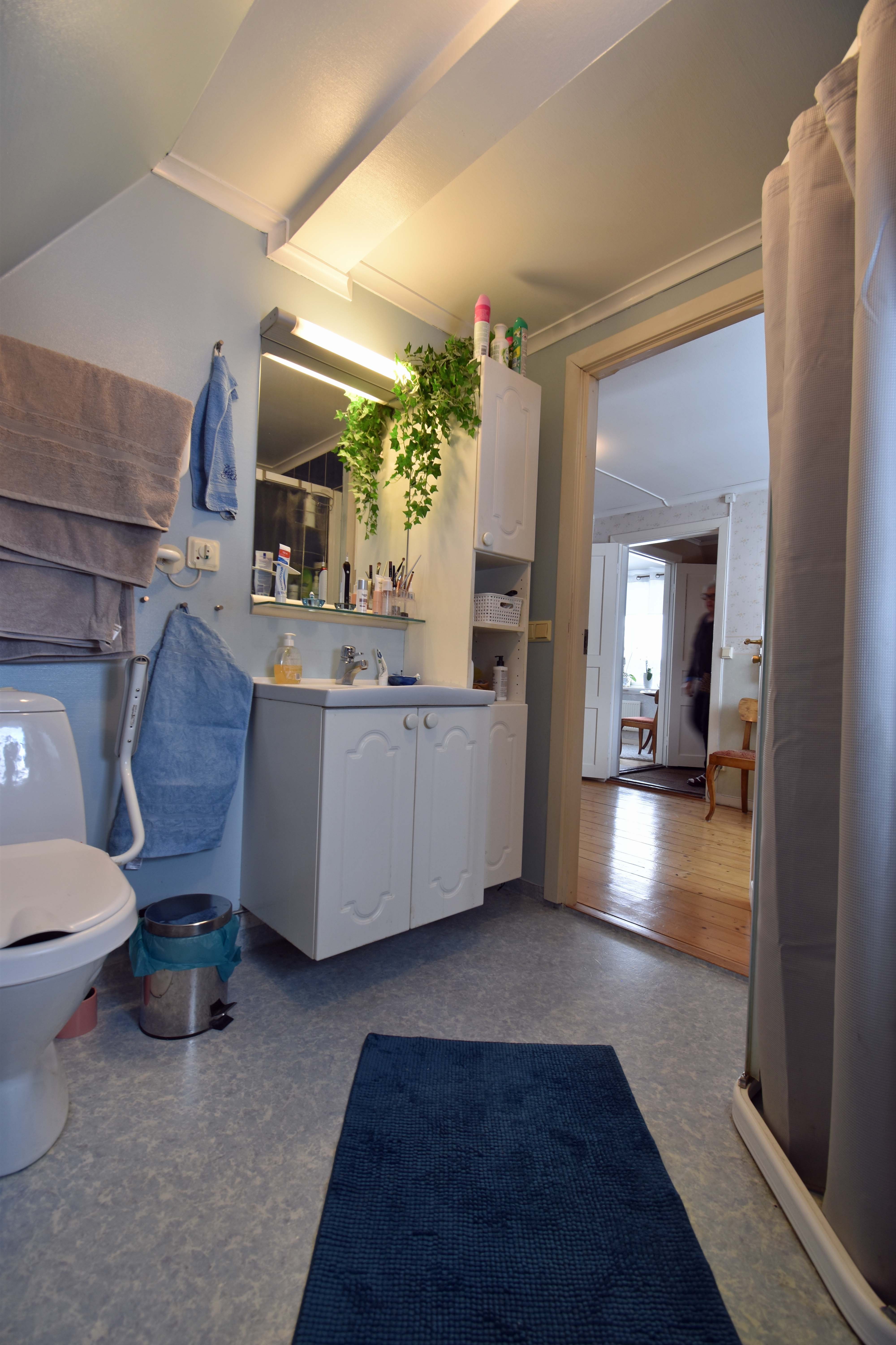 Ovanvåning med trapphall, två sovrum, ett genomgångsrum, en toalett med dusch och wc, samt två kattvindar.