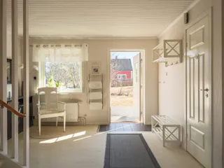 Entré sker via tillbyggnaden som rymmer en rymlig hall med gott om plats för ytterkläder. Här finns även en WC utrustad med toalett och handfat. Vidare in nås en inre hall med trappa till både övervåning och källarplan samt en praktisk groventré.