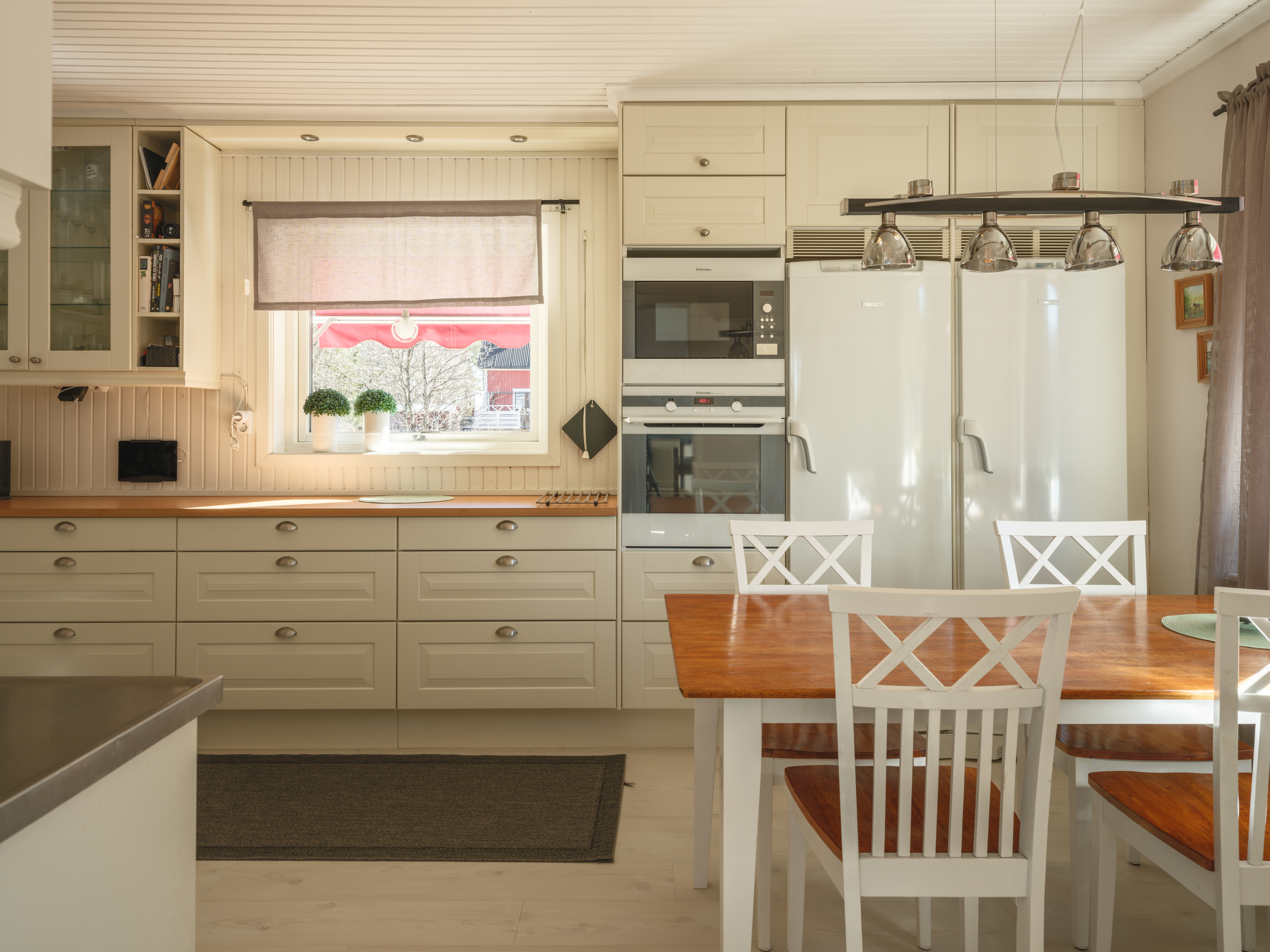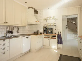 Köket är ljust och trivsamt med spegelluckor, vitrindetaljer, spotlightbelysning och en rymlig matplats. Köket är utrustat med spis och spishäll, diskmaskin, inbyggd varmluftsugn och mikrovågsugn samt fullstor kyl och frys.