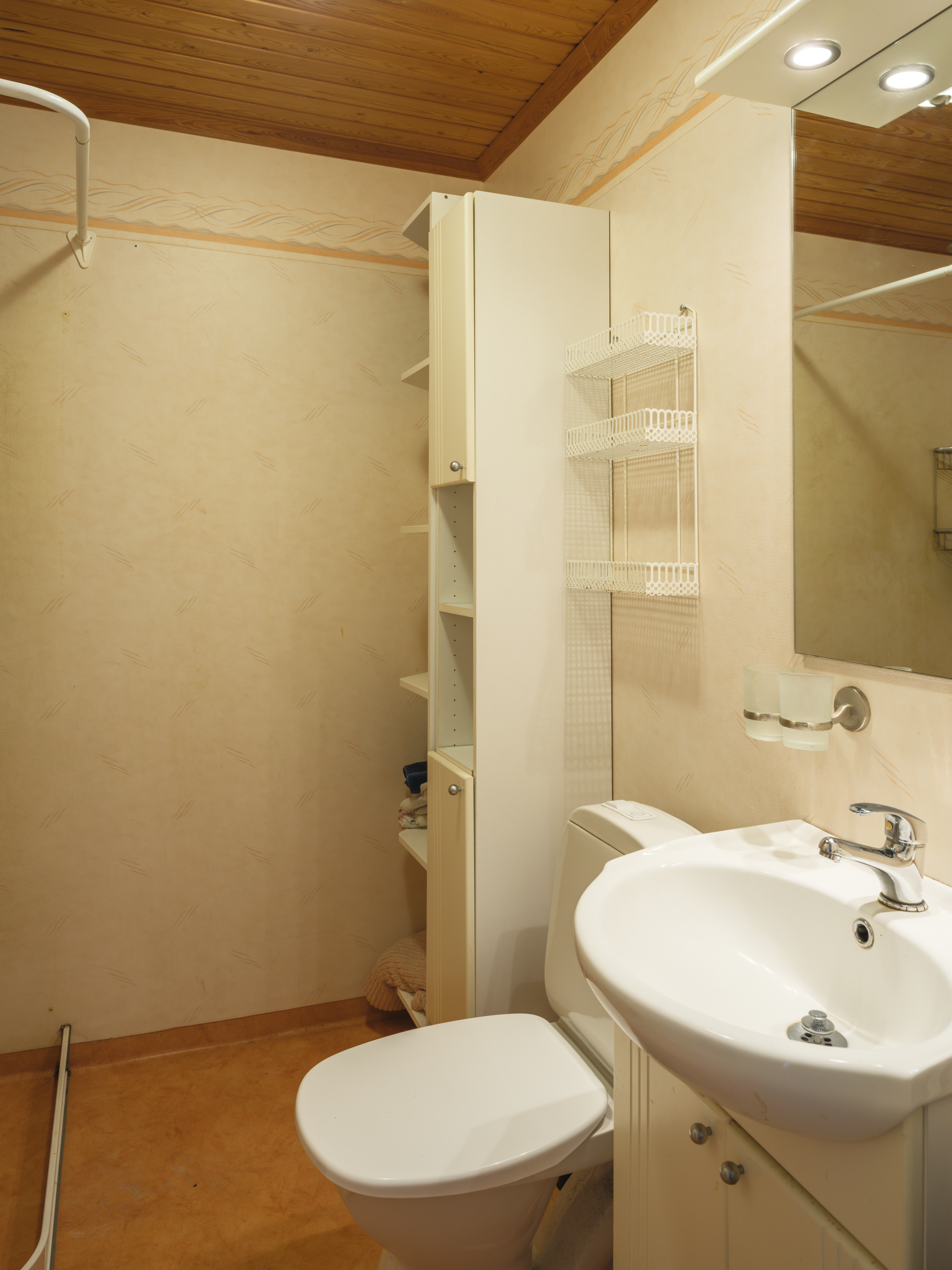 På övervåningen finns ett badrum från 1997 med våtrumsmatta på golv och vägg. Här finns dusch, WC och handfat.
