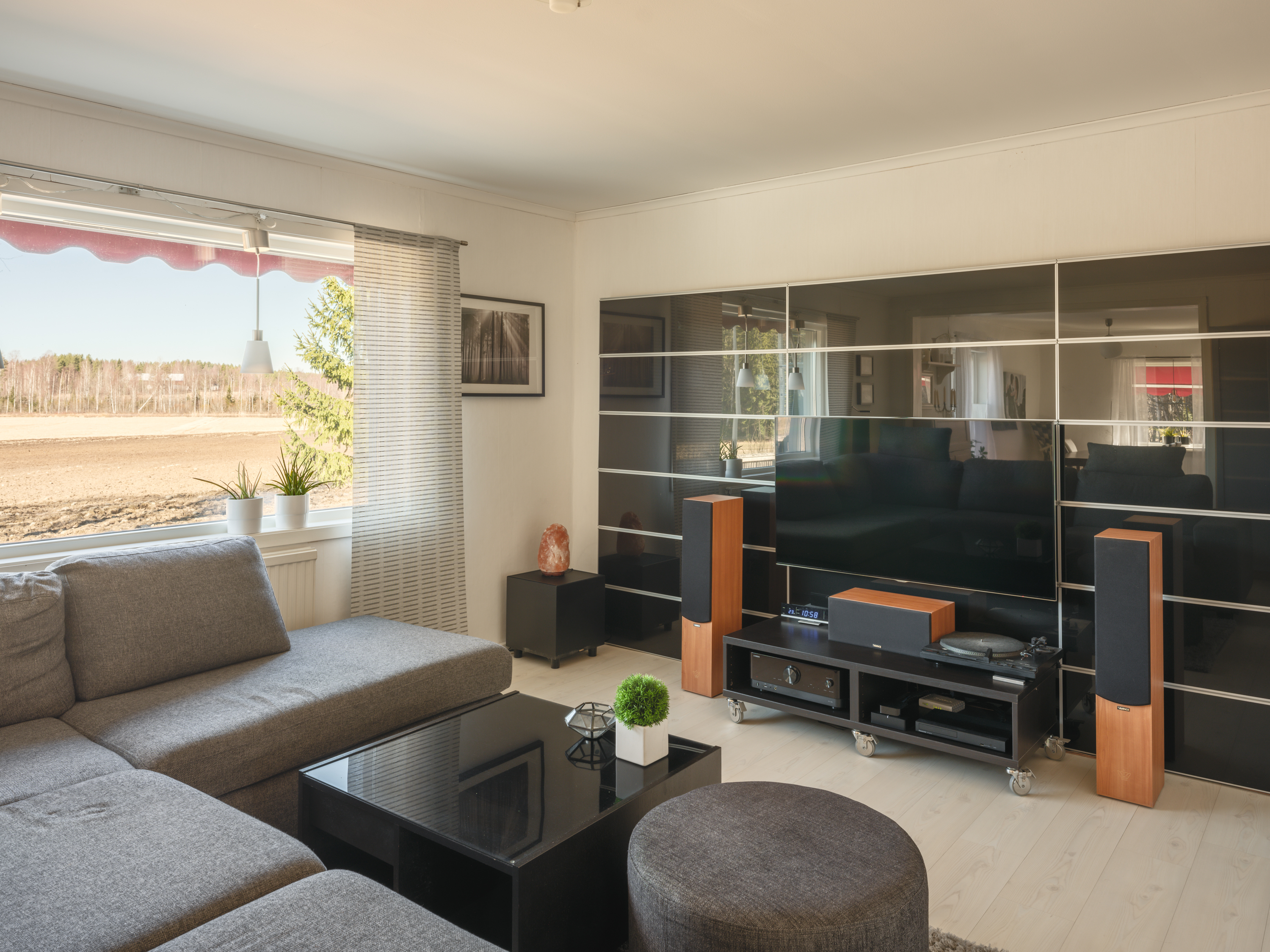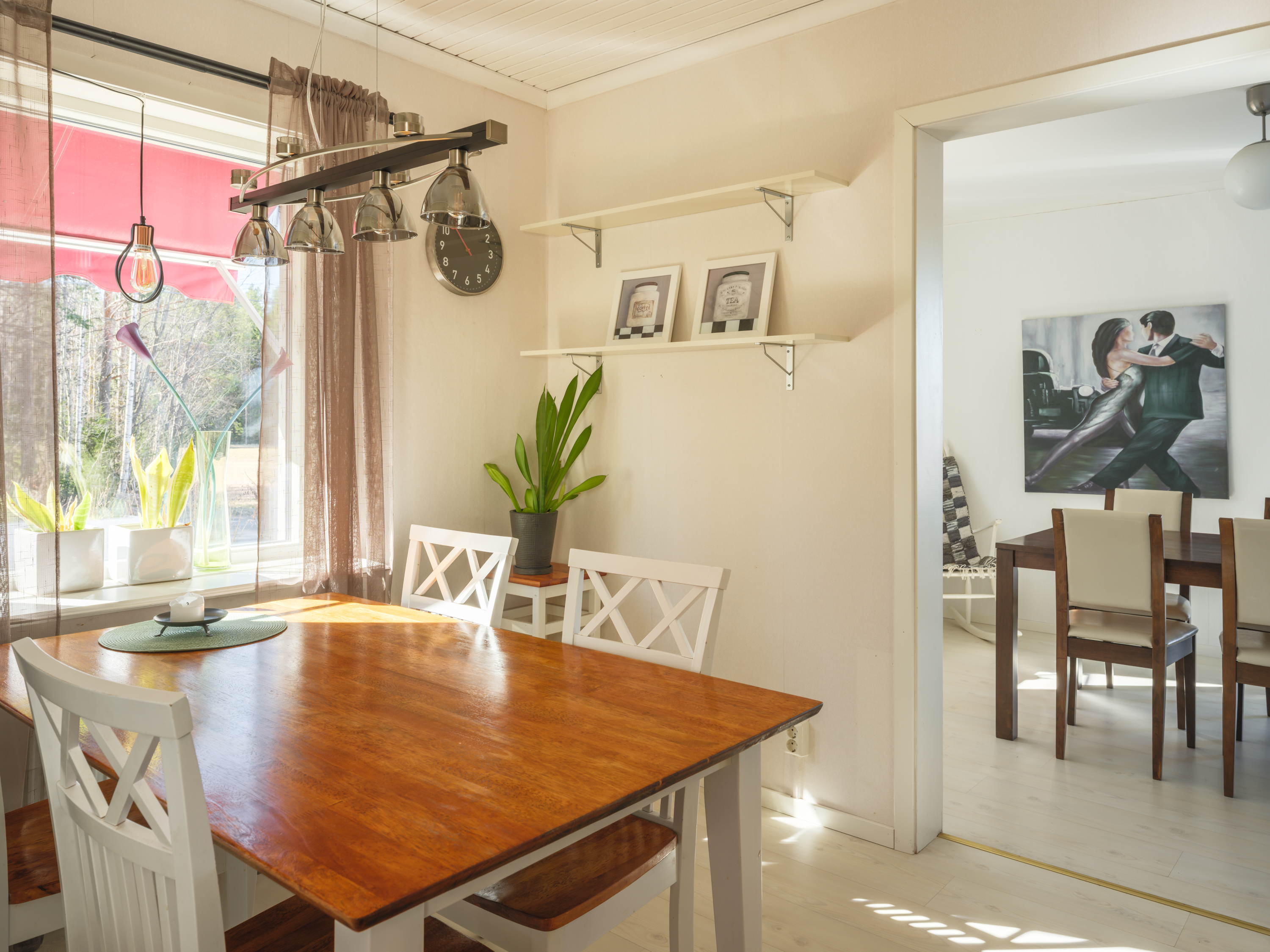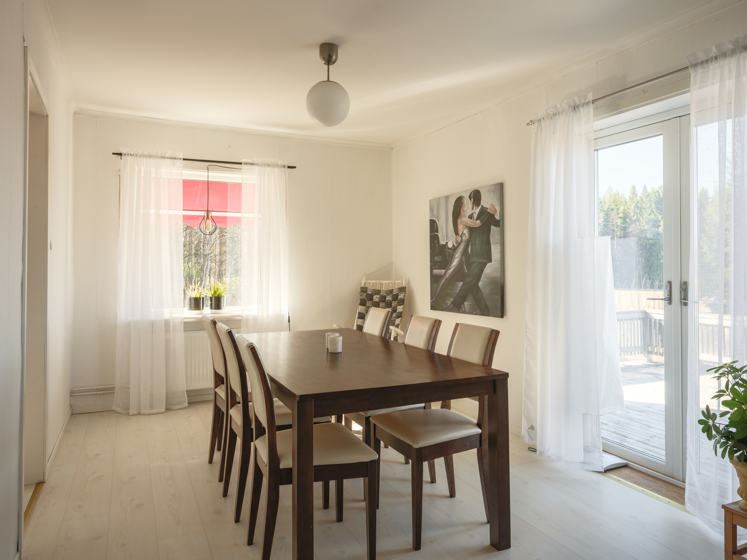 Intill köket ligger matrummet med fint ljusinsläpp och glasad dubbeldörr ut till soldäcket i västerläge. Härifrån ges en vacker vy över gårdens marker och mot Bureälven. Från matrummet nås vardagsrummet som även har passage tillbaka till hallen, vilket skapar en trevlig rundgående planlösning på entréplanet.