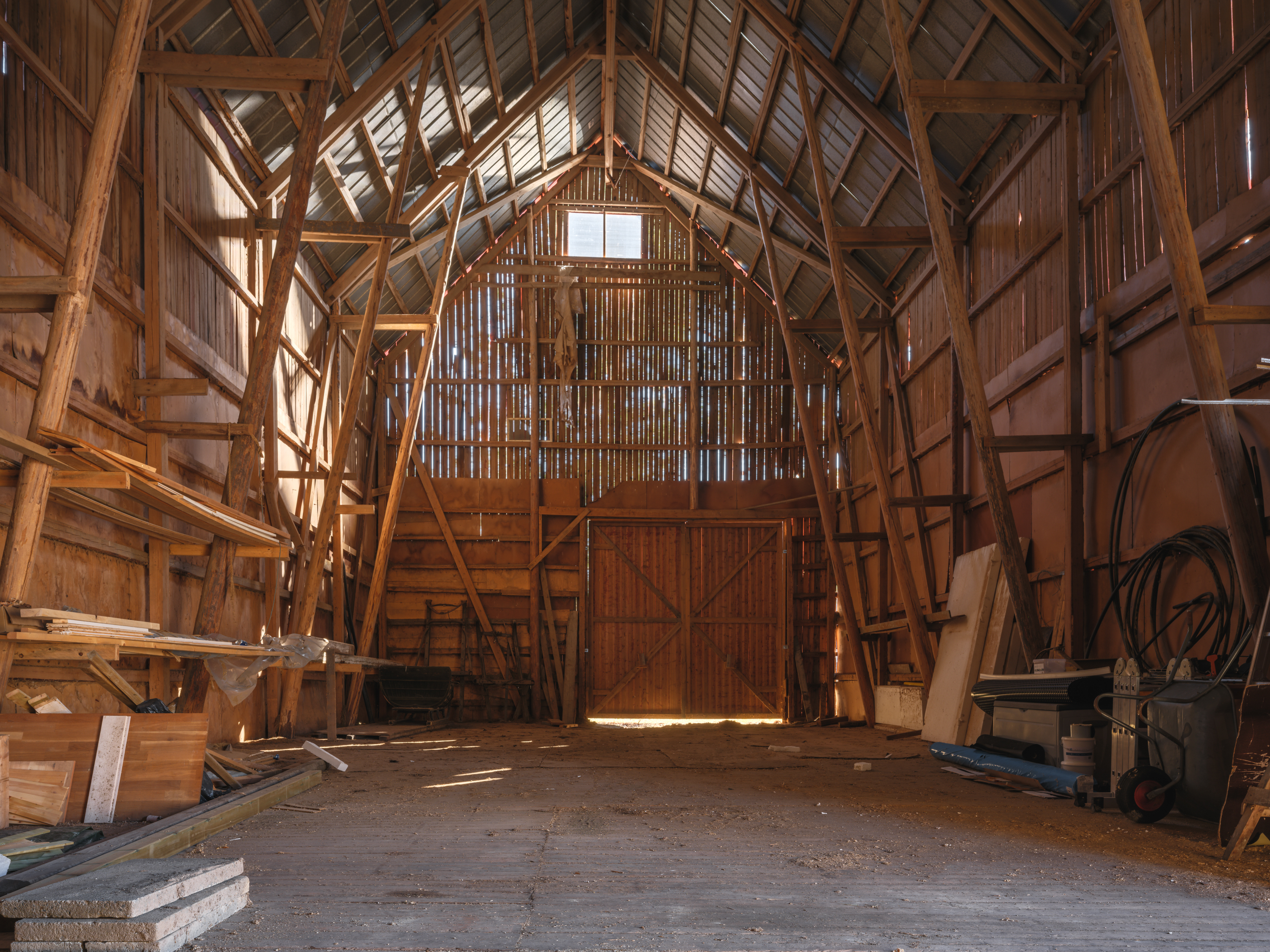 På baksidan av ladugården finns dessutom praktiska skärmtak som ger bra förvaringsmöjligheter för maskiner, redskap eller annat material.