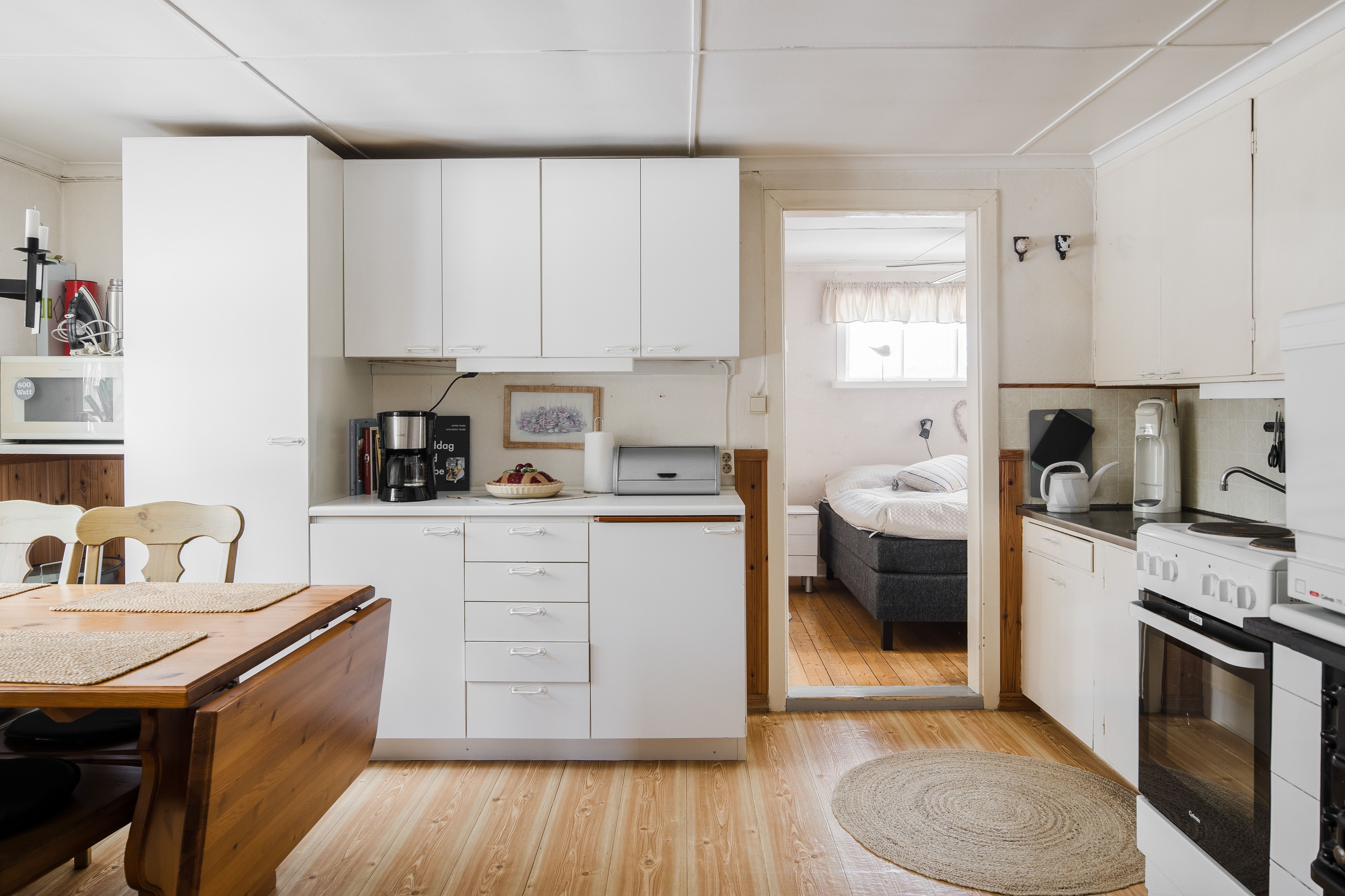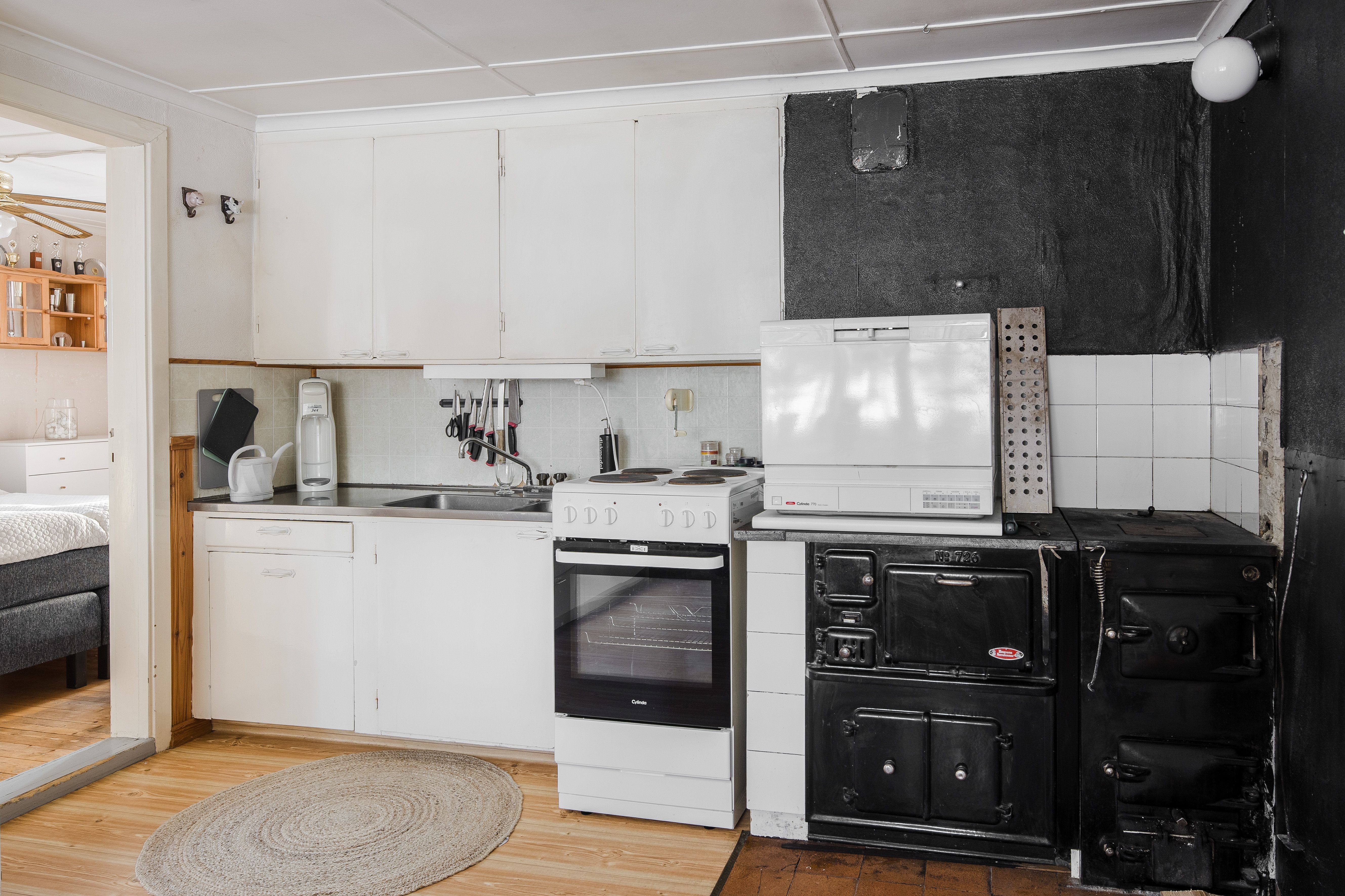 Kök med vita köksskåp och plastmatta på golvet. Köket är utrustat med spis, kyl/frysskåp, vedspis, kökspanna och lucka till liten matkällare.