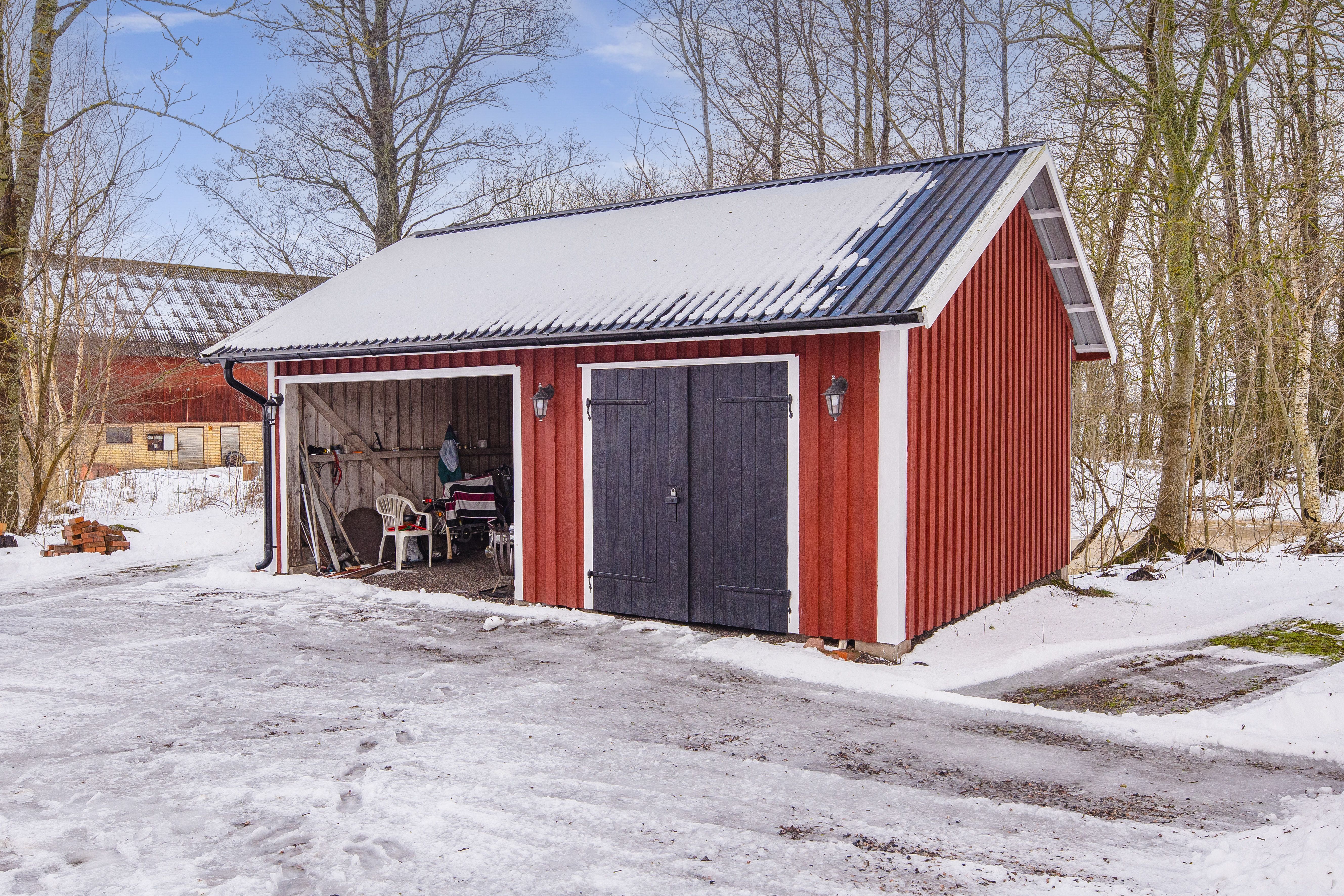 Byggnad från 2005, uppförd i trä med plåttak och grusat golv. Inrymmer carport och förråd.
