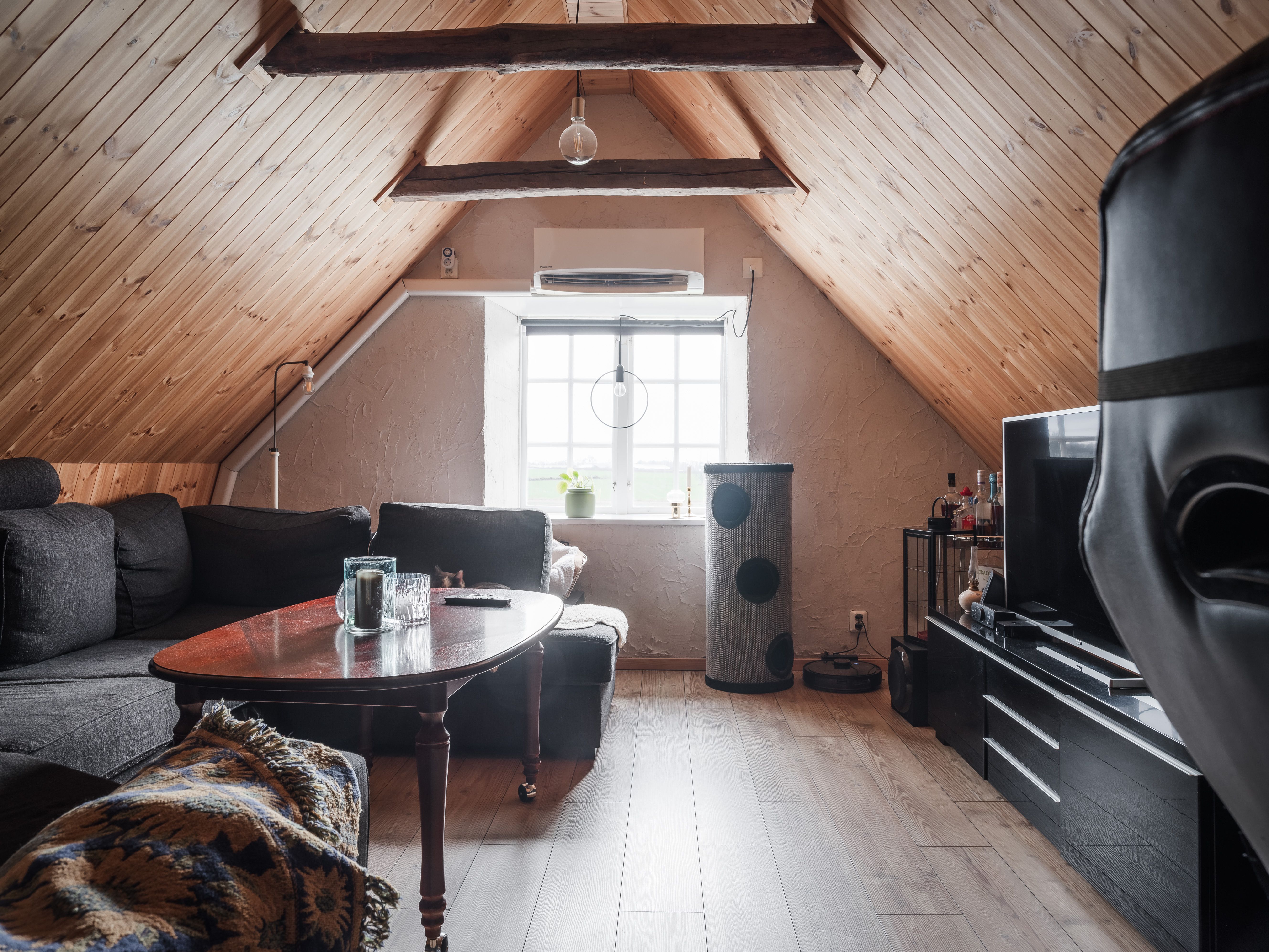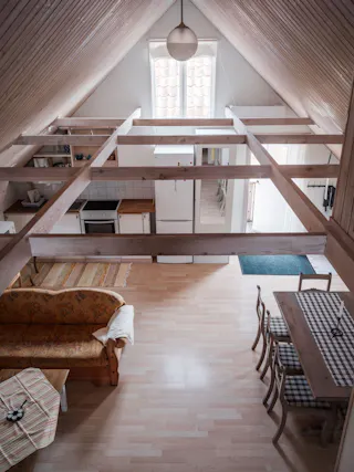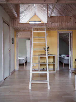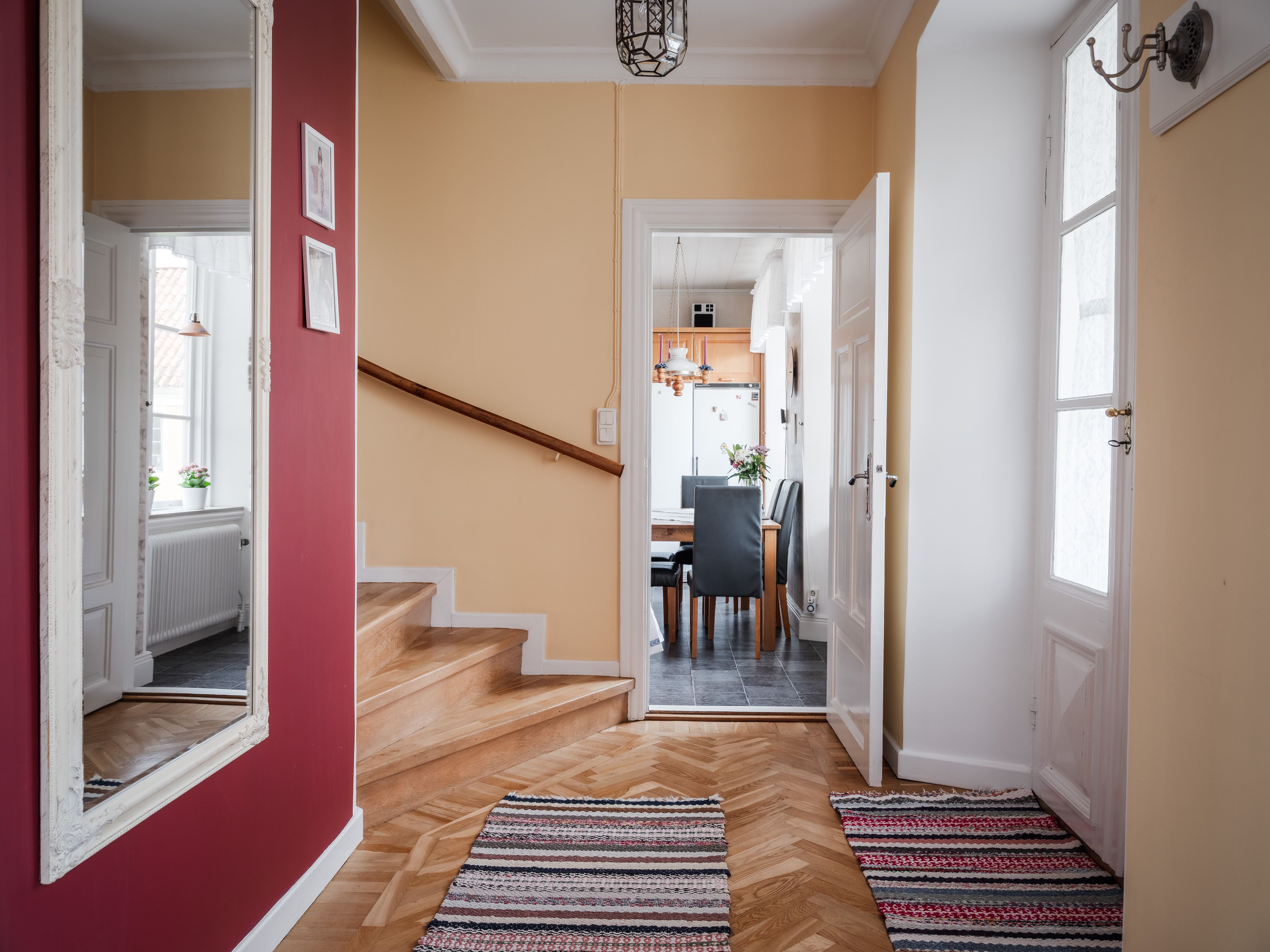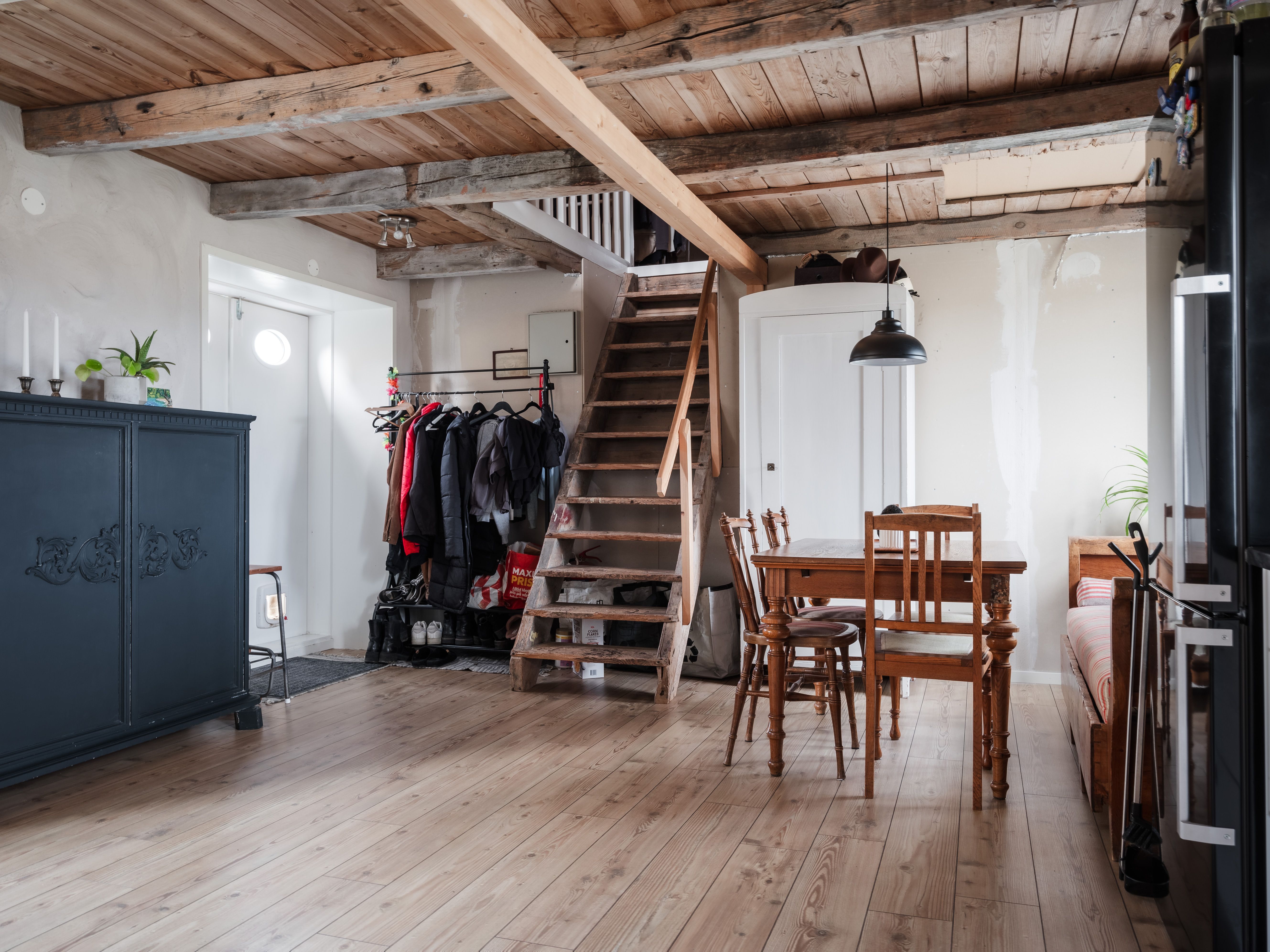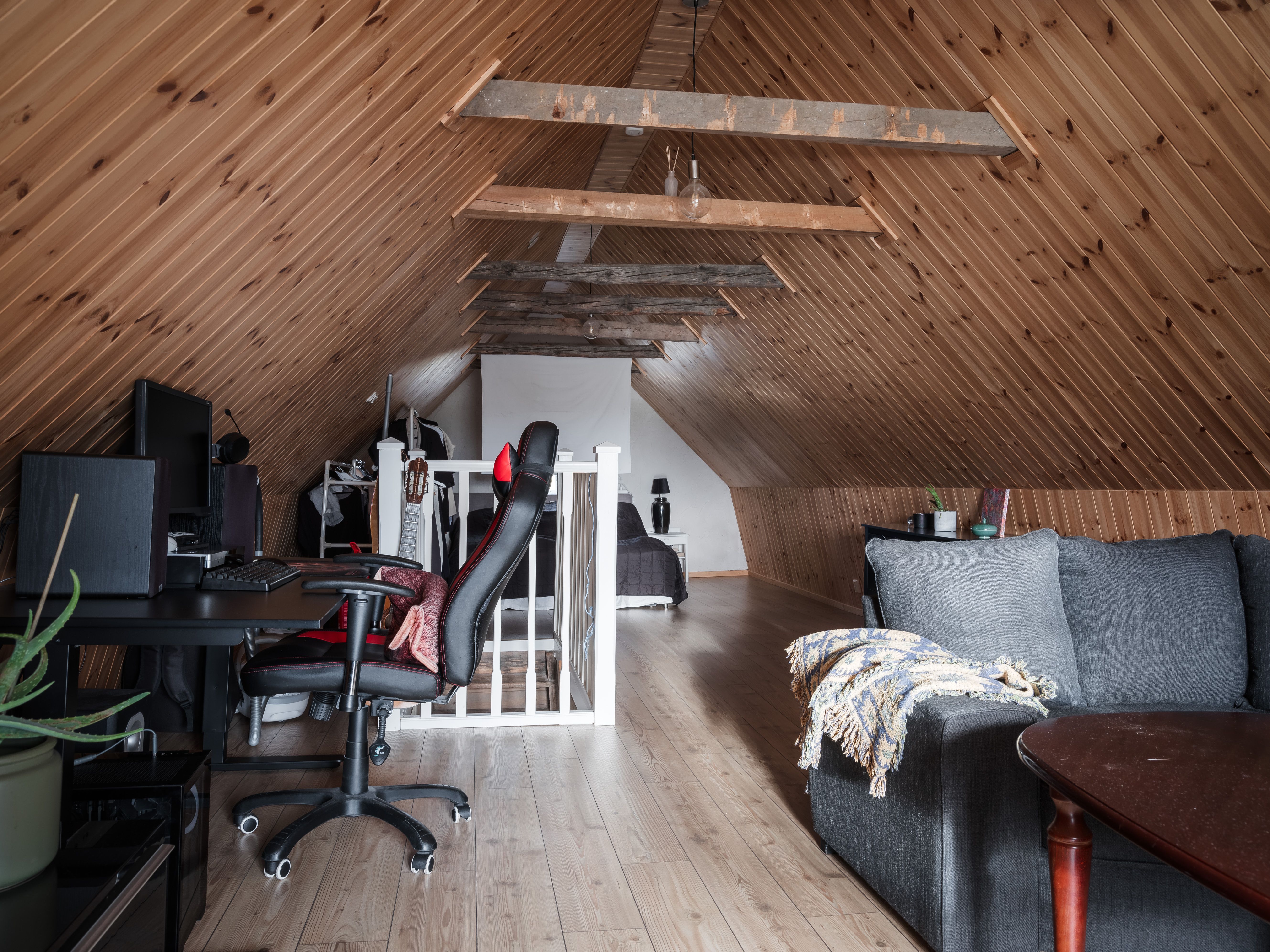 Från hallen når man via trappa den rymliga vinden ovanför.