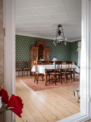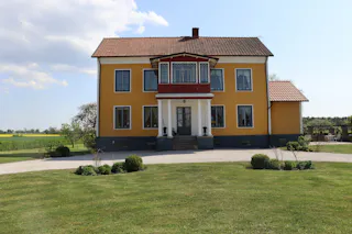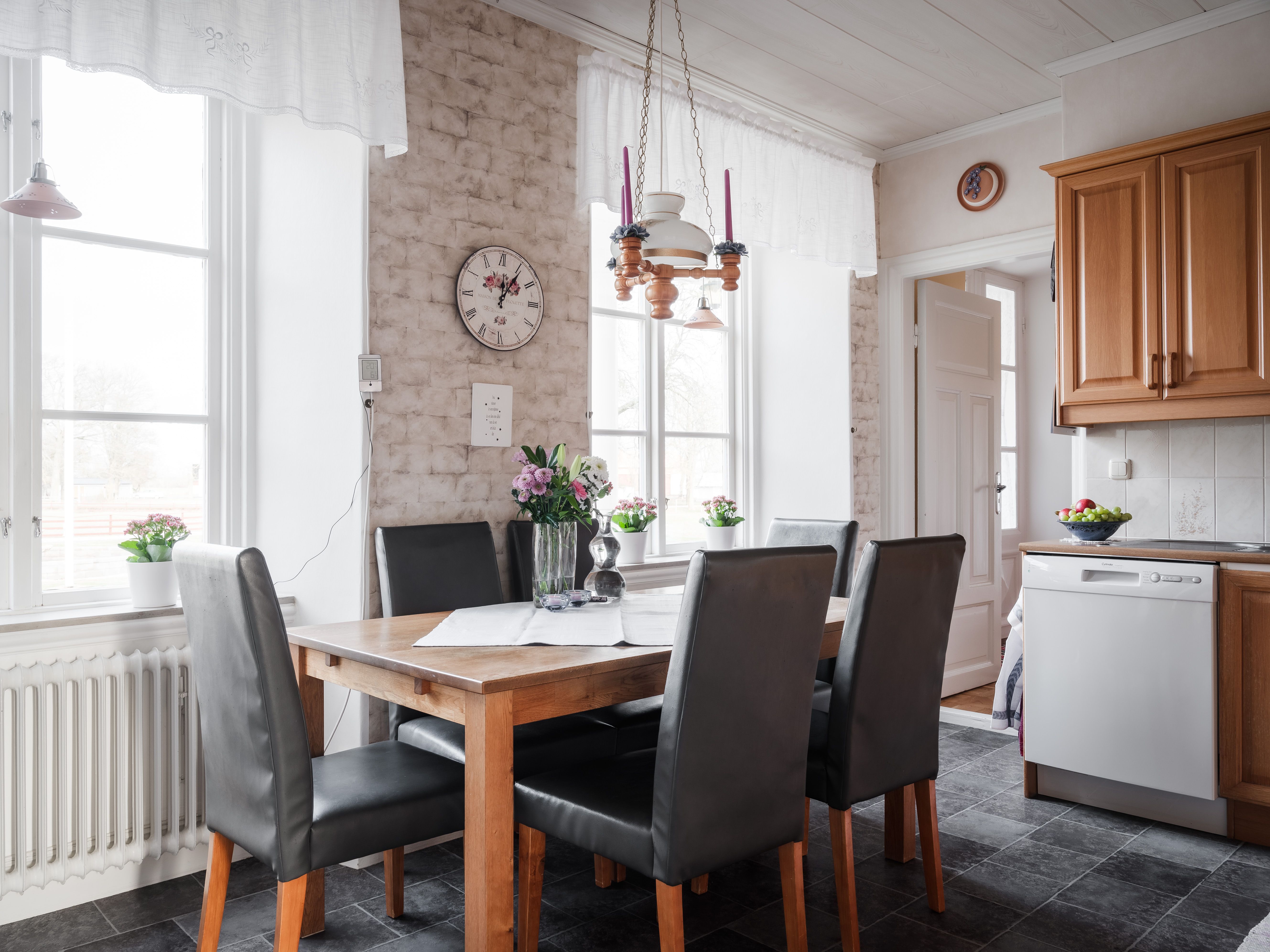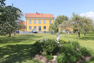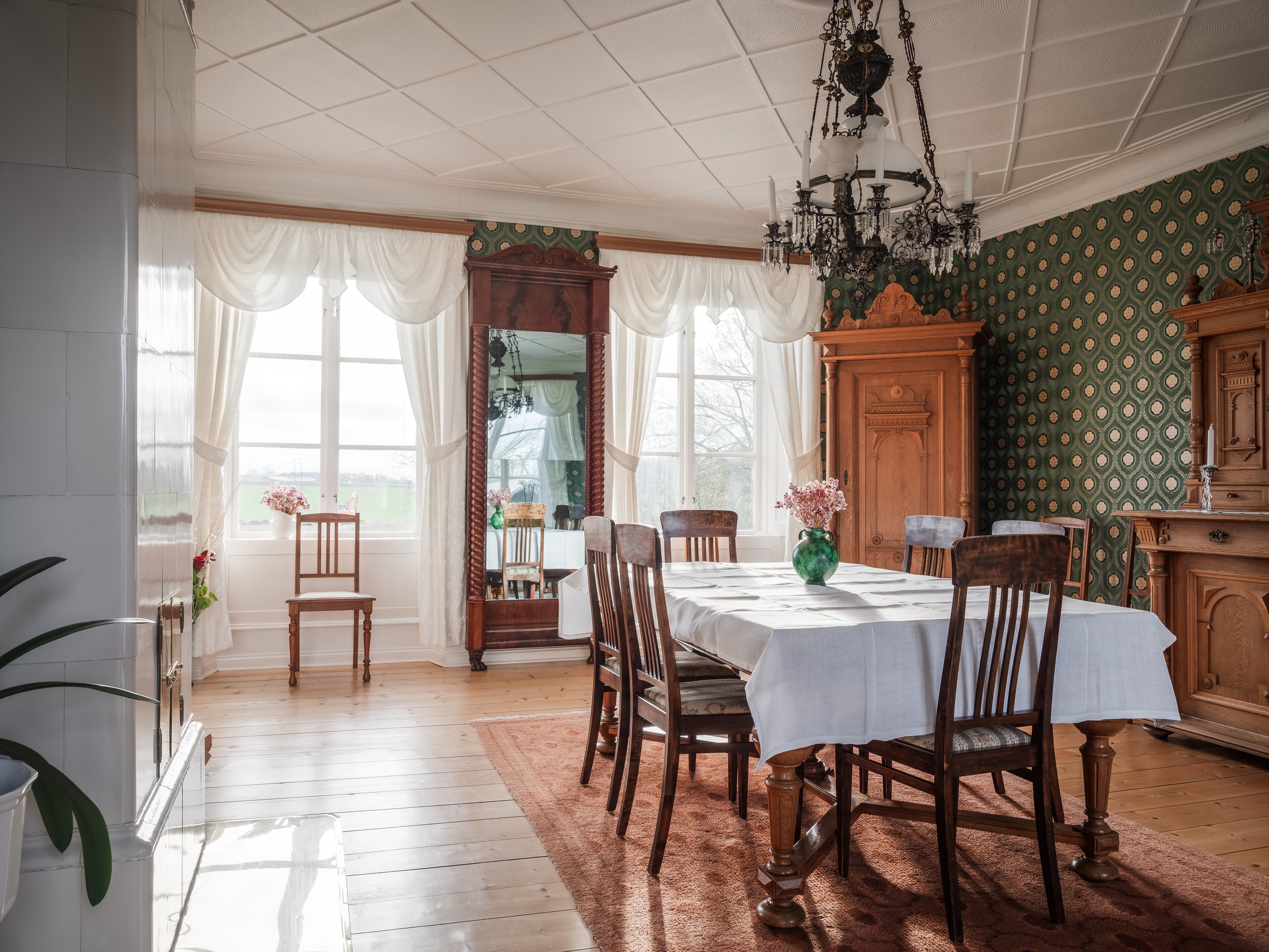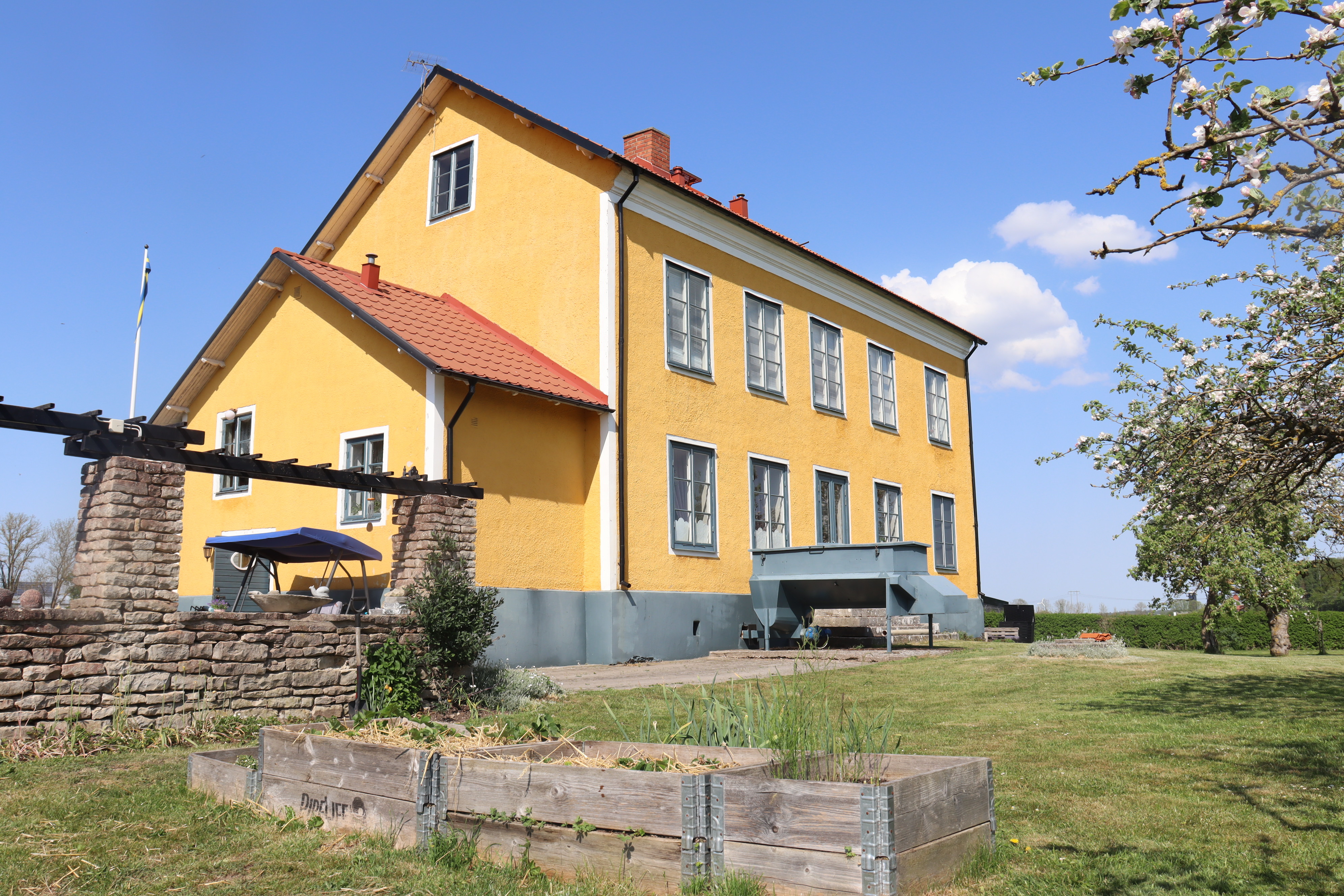 Vackert stenhus med 2 hela bostadsplan i full takhöjd samt källare och vindsutrymmen därtill. Sannolikt uppfört omkring år 1850. Boarea om 220 m² enligt försäkringsbrev. Huset är mycket välhållet och det finns en genomgående bra känsla och många fina detaljer såsom djupa nischer, pardörrar och kakelugnar. Tak av tegel samt plåt (-97) över tillbyggnaden samt kopplade 2-glasfönster. Vattenburen uppvärmning via bergvärmepump från Nibe (2019). I reserv finns den tidigare flispannan. Eget vatten via borrad brunn. Eget avlopp i form av 3-kammarbrunn med infiltration. Anläggning med beslutsår 2016 och utfört år 2017, godkänt för 3 hushåll. Fastigheten är fiberansluten med 2 abonnemang. Ett till mangård/flygel och ett till den tidigare magasinsbyggnaden.
