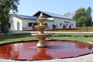 Framför huset finns en grusrundel samt en vacker fontän. På baksidan av huset en riktigt underbar trädgård med gott om fruktträd och fina möjligheter till odlingar. Plattlagd uteplats på gaveln vid groventrén och den sträcker sig även vidare runt hörnet mot trädgården på baksidan.