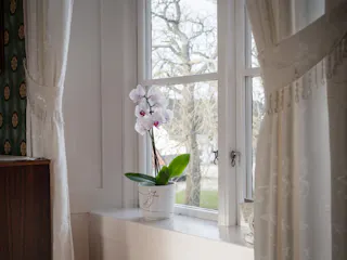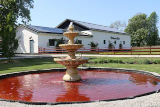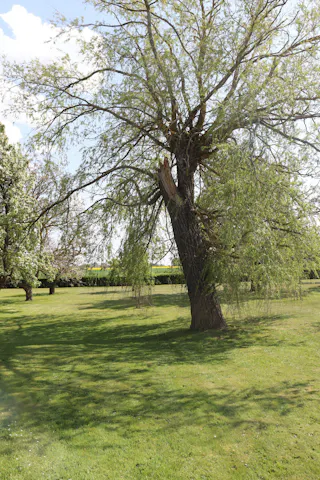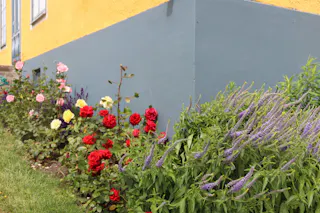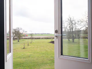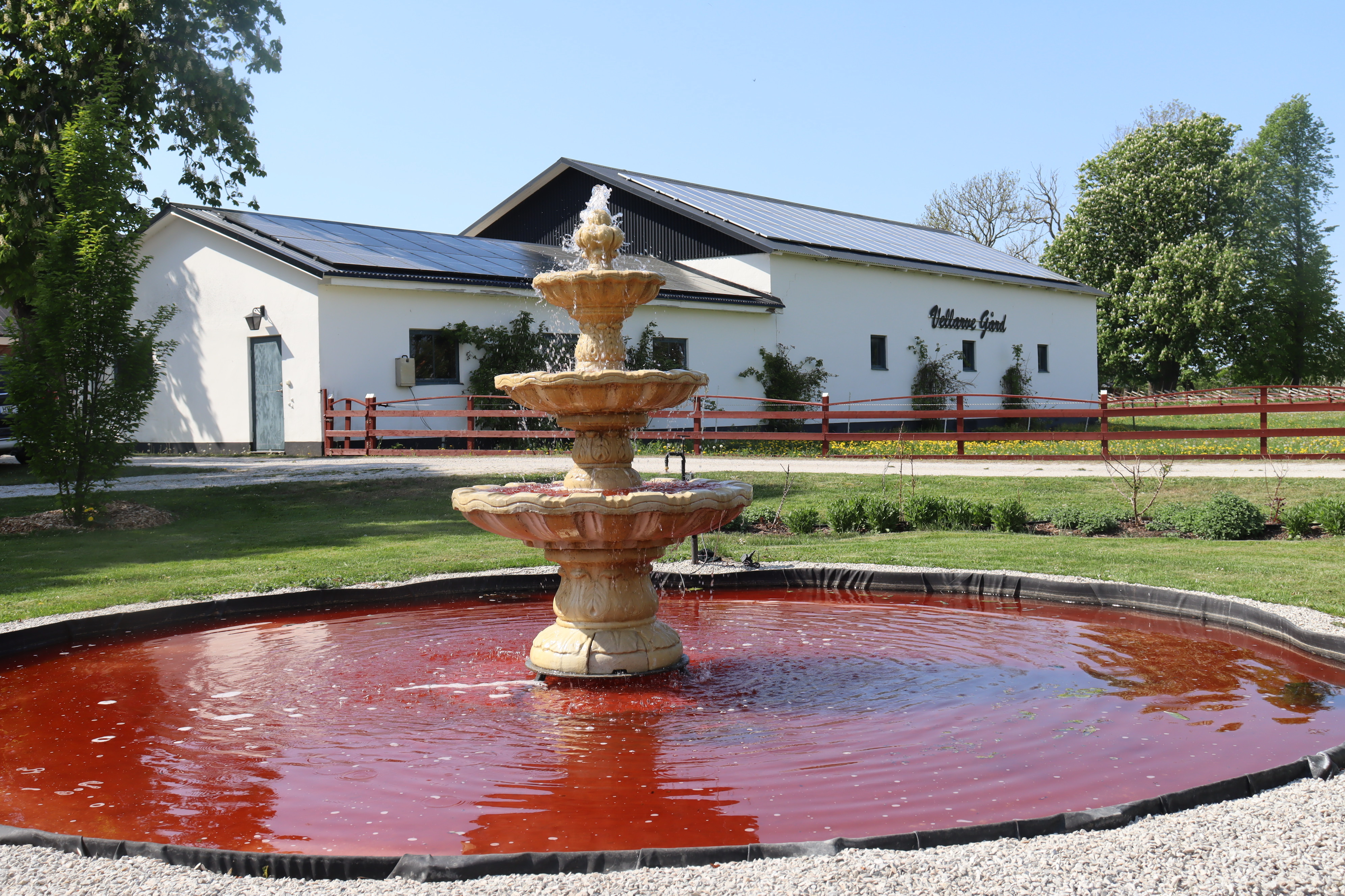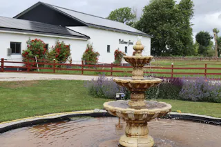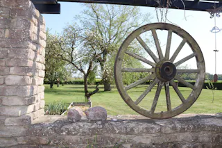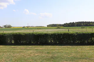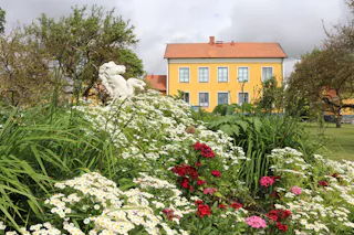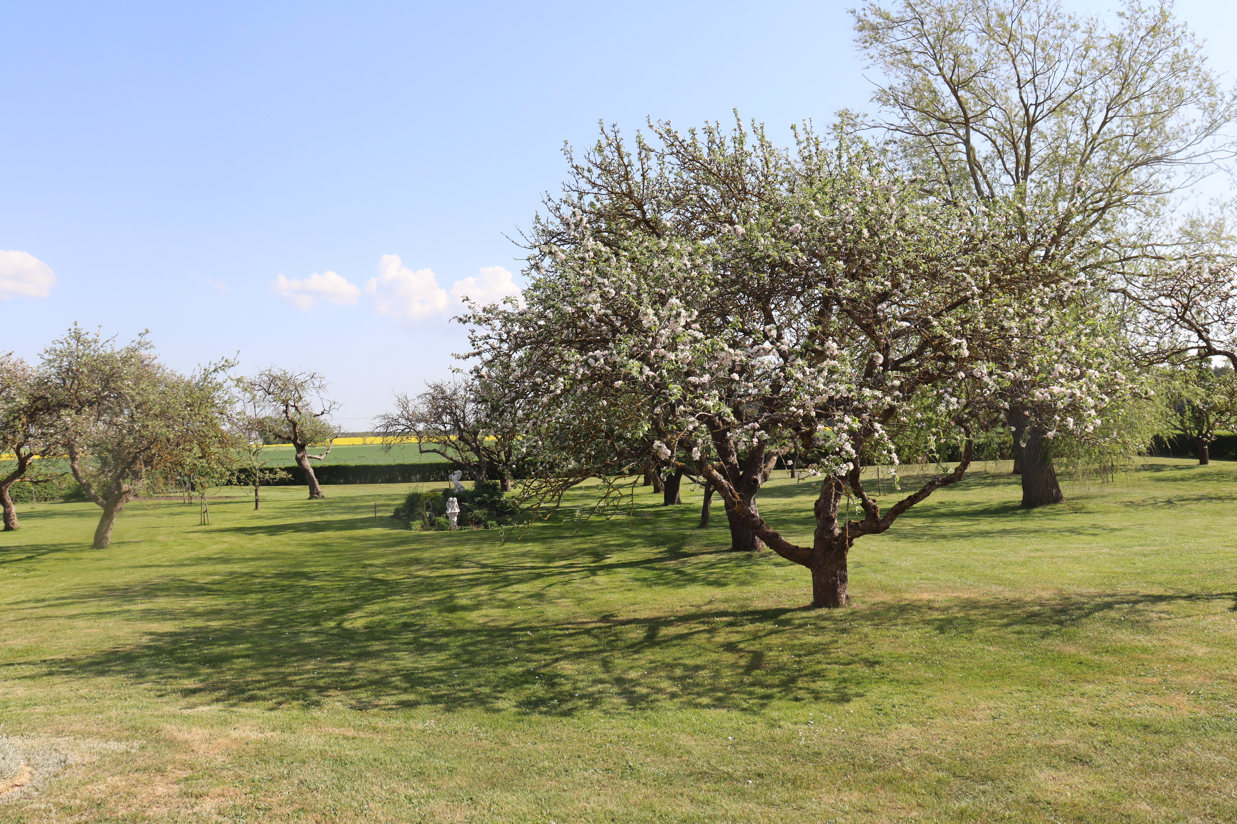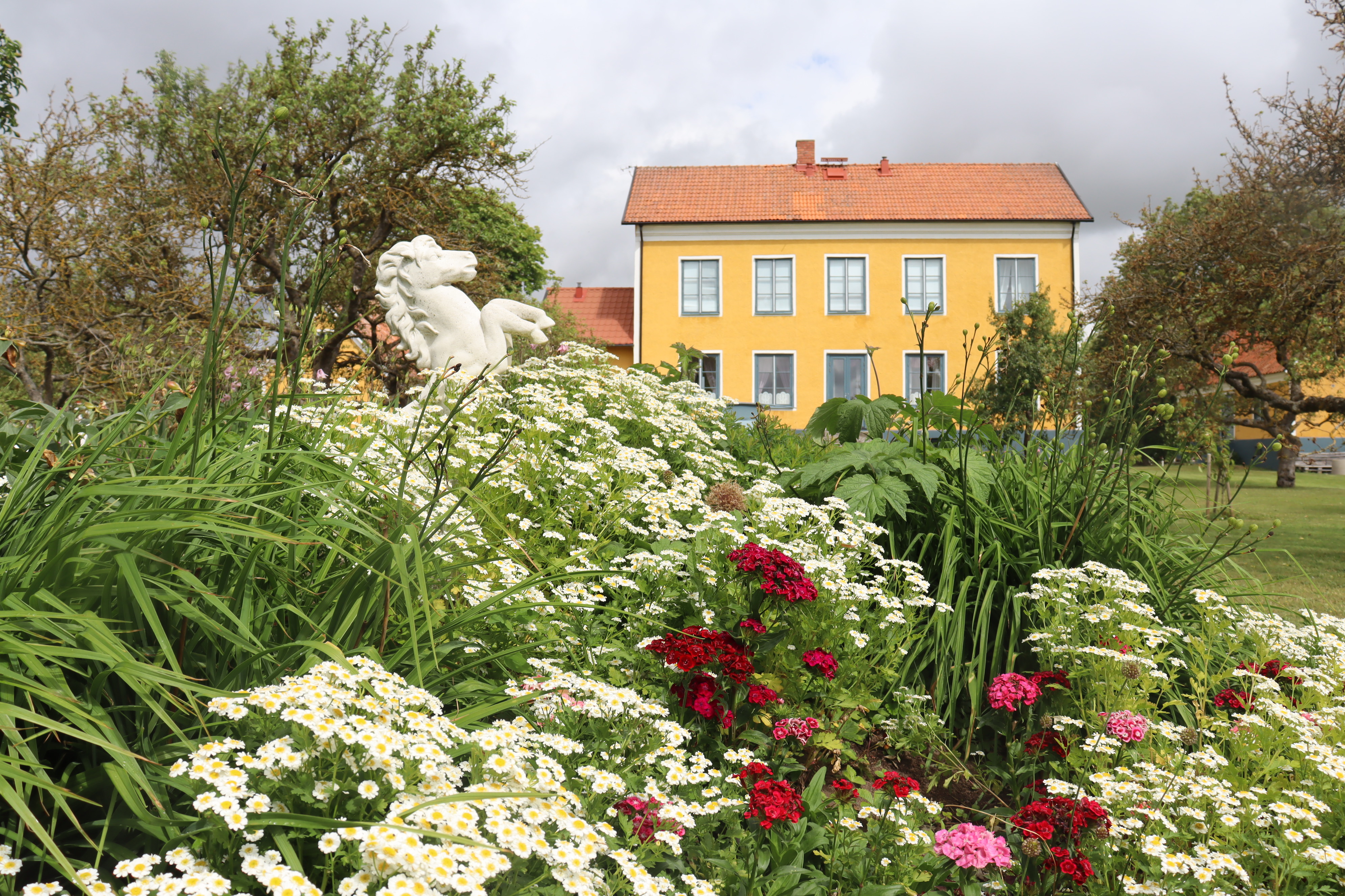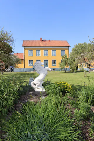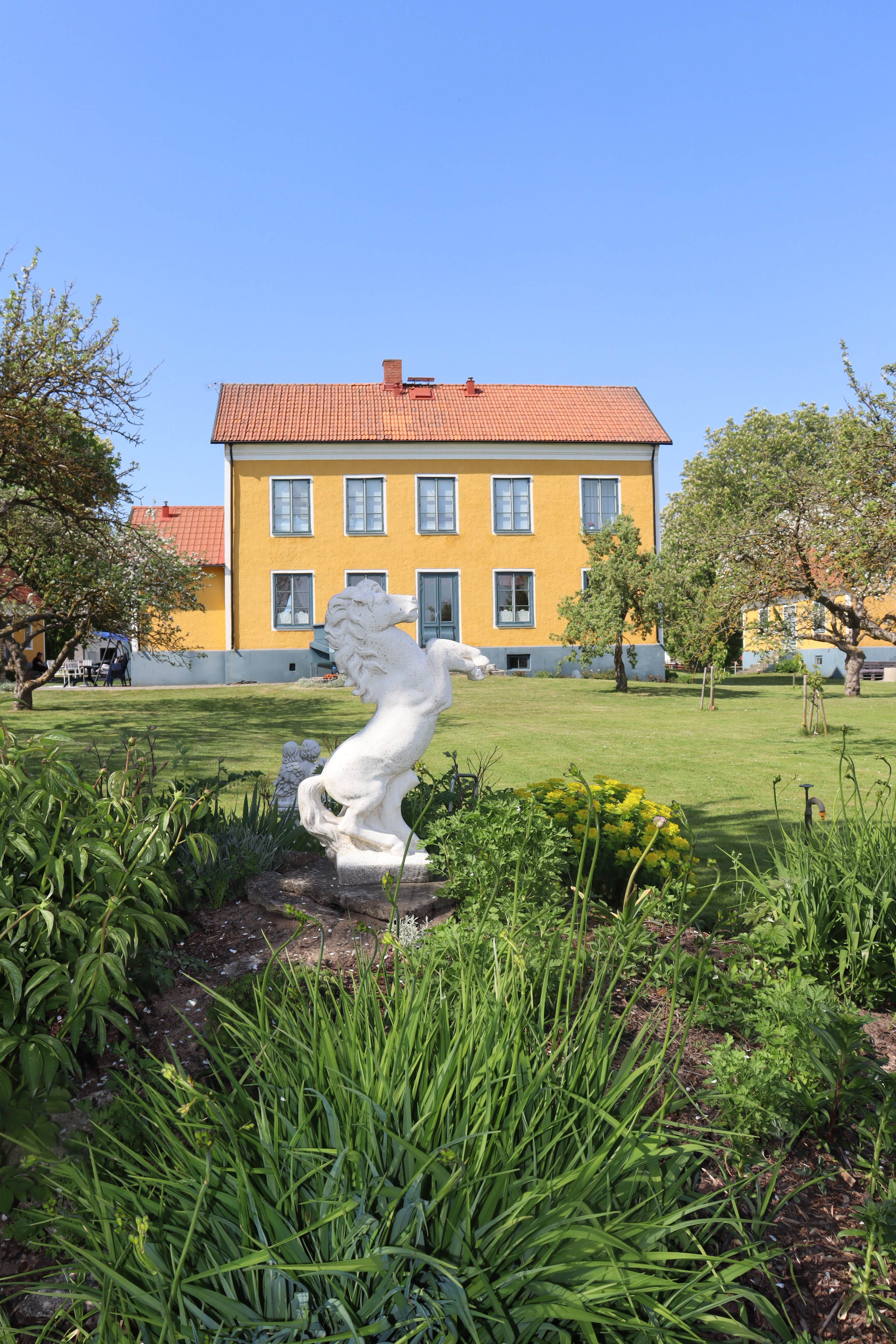 Trädgården omgärdas av häck mot det omgivande jordbrukslandskapet med egna beteshagar närmast intill.