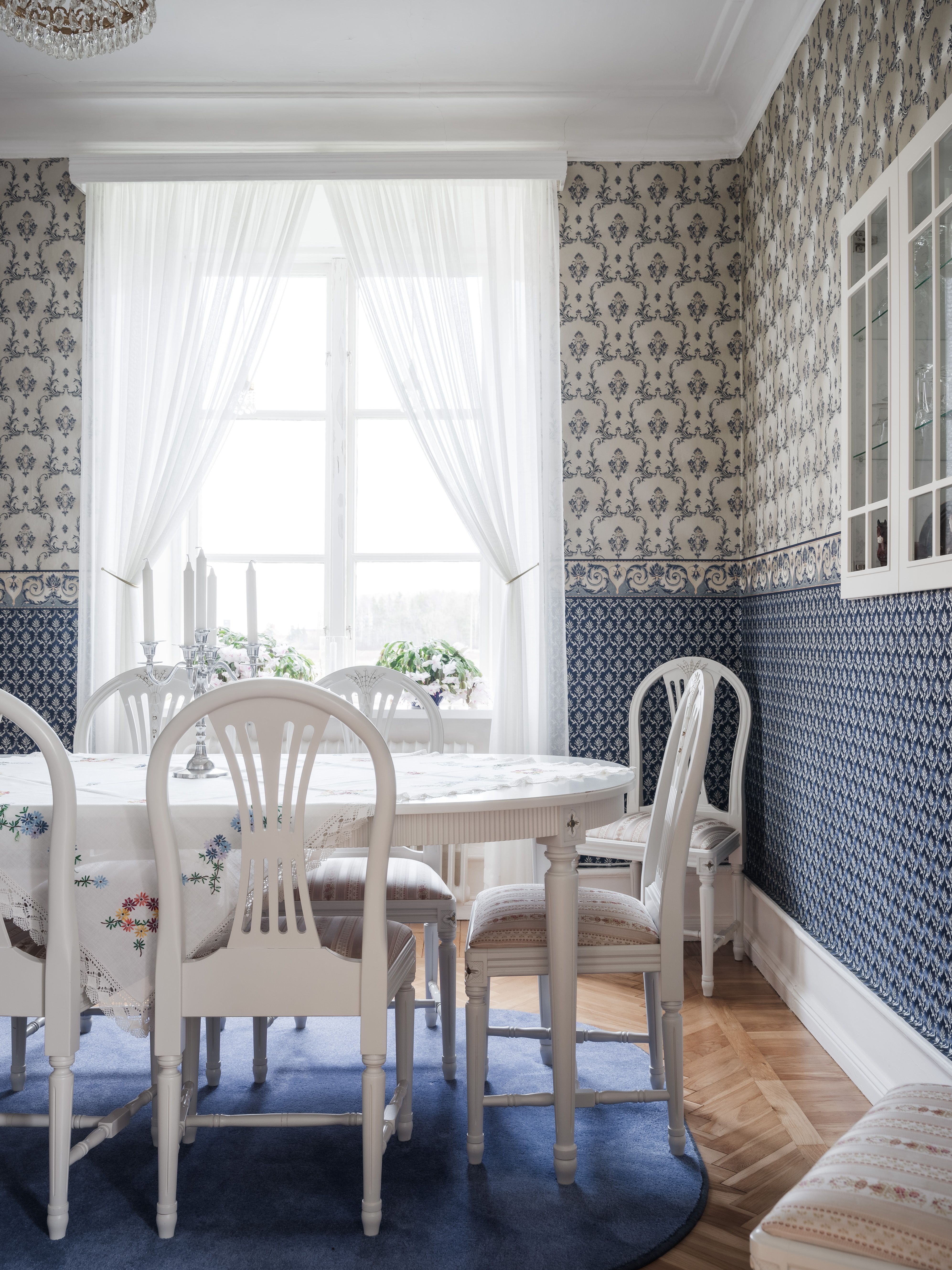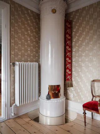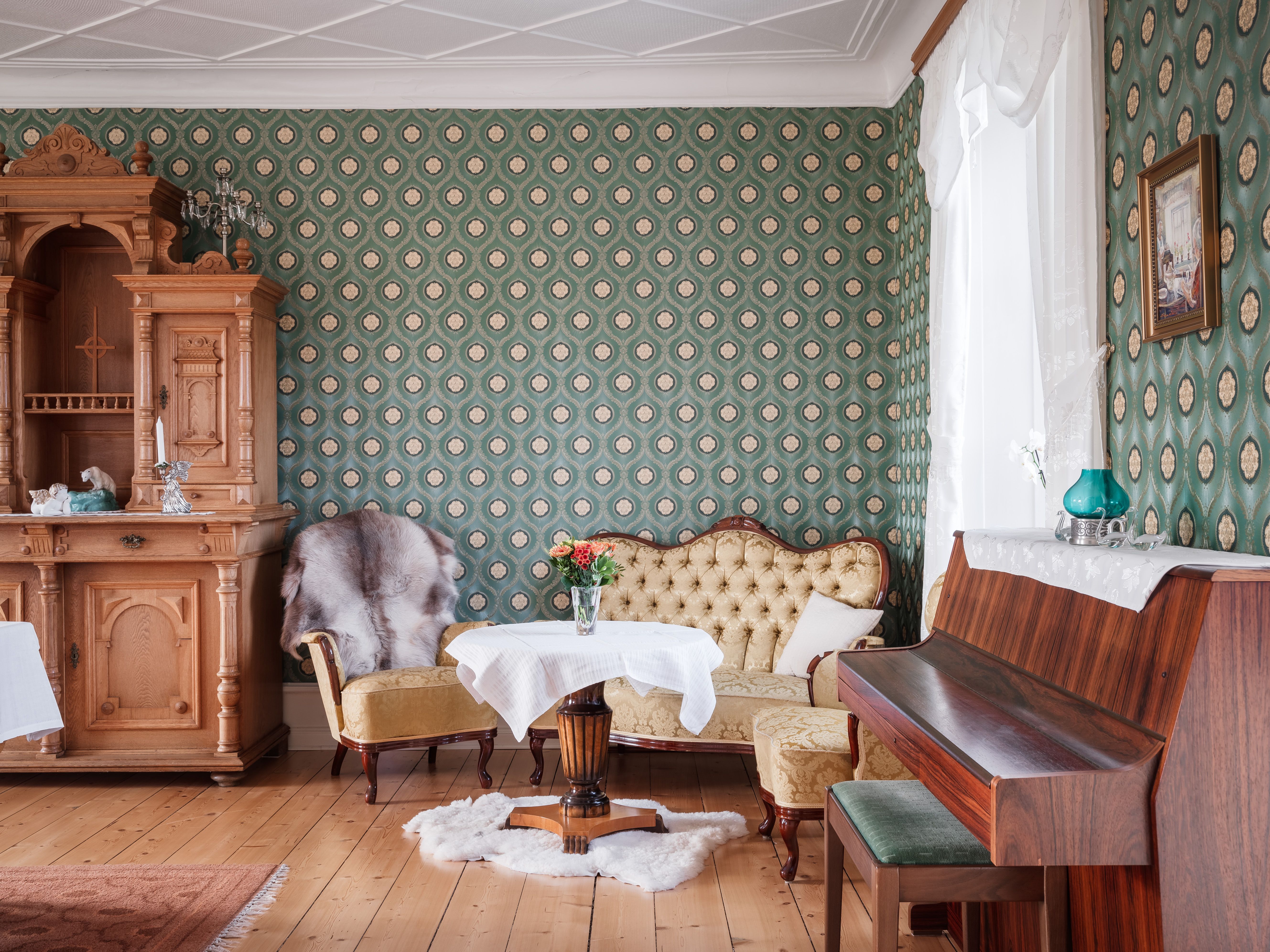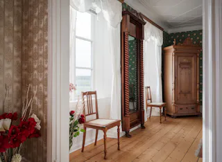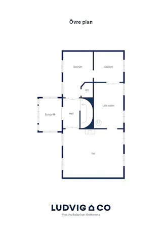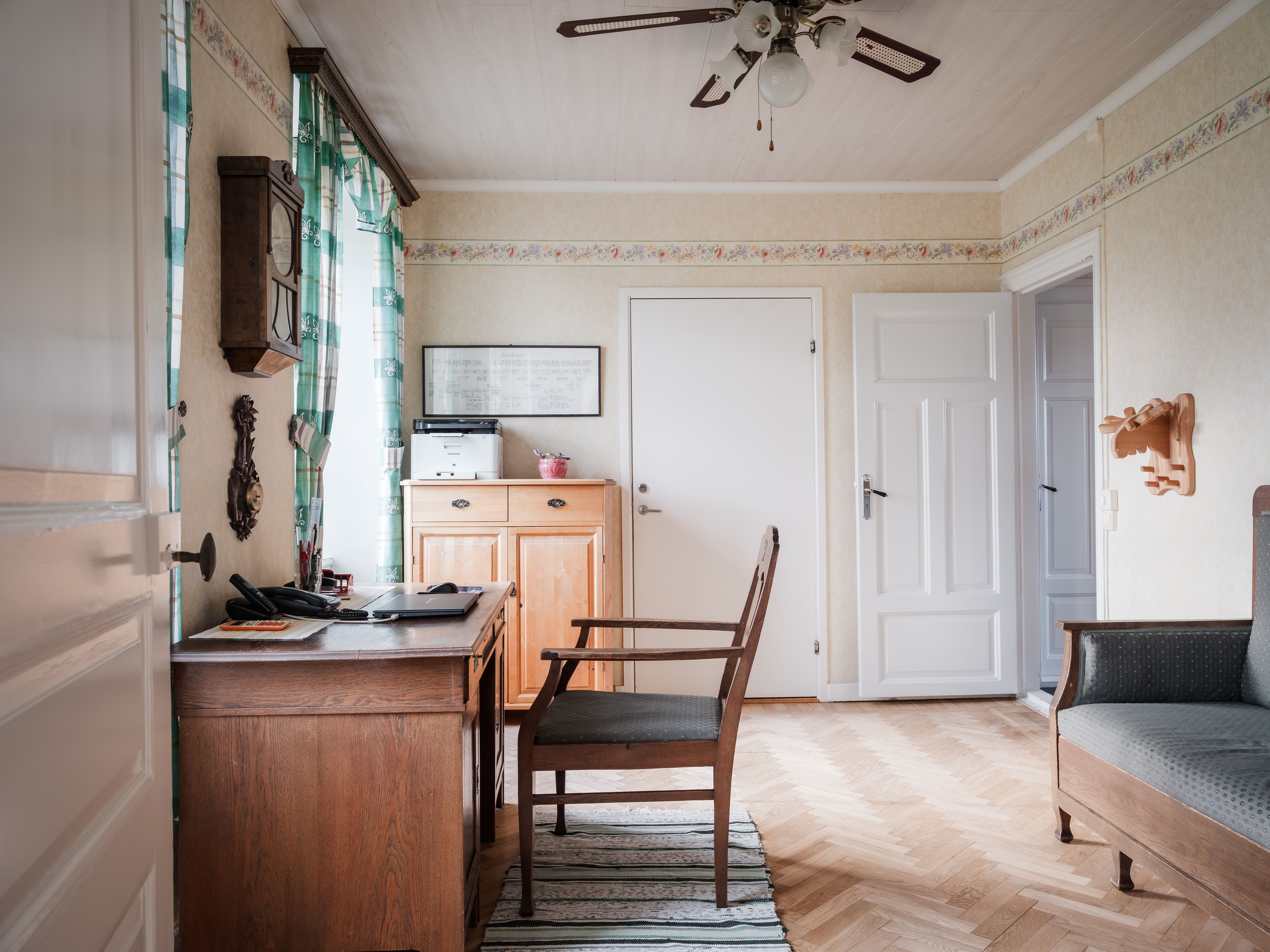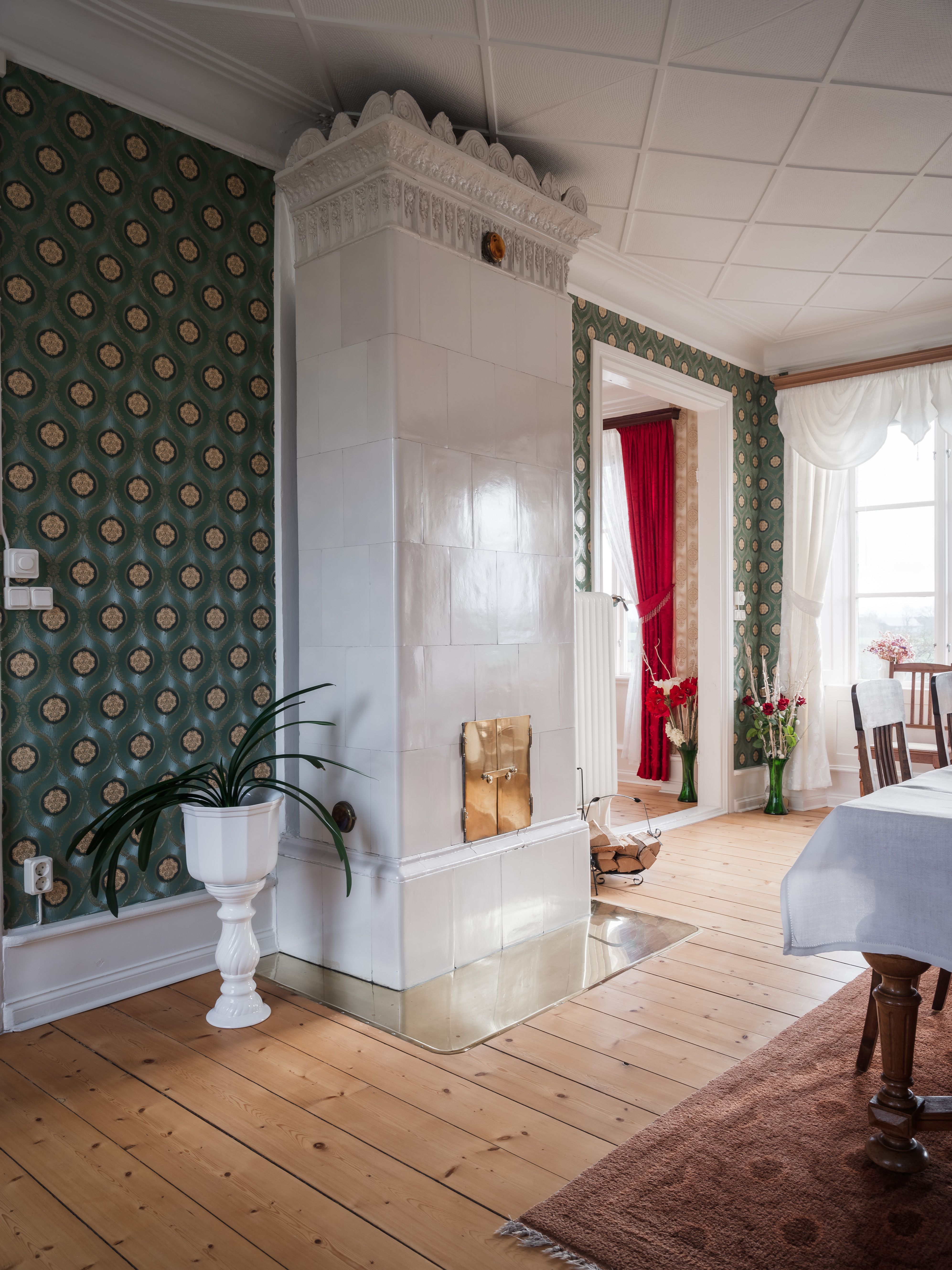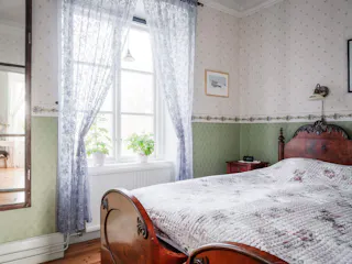 Övervåningen inrymmer hall med parkettgolv. Inbyggd veranda/tv-rum (ovanför finentrén). Sovrum med trägolv, dörr till WC-rum med tvättställ. Sovrum med trägolv. Lilla salen med trägolv och kakelugn (ok men ej använd på länge). Rymlig sal med trägolv och kakelugn som är godkänd att elda i.