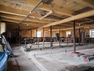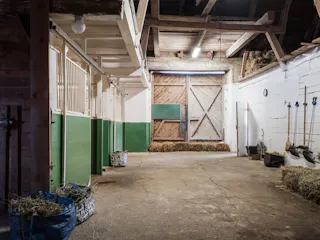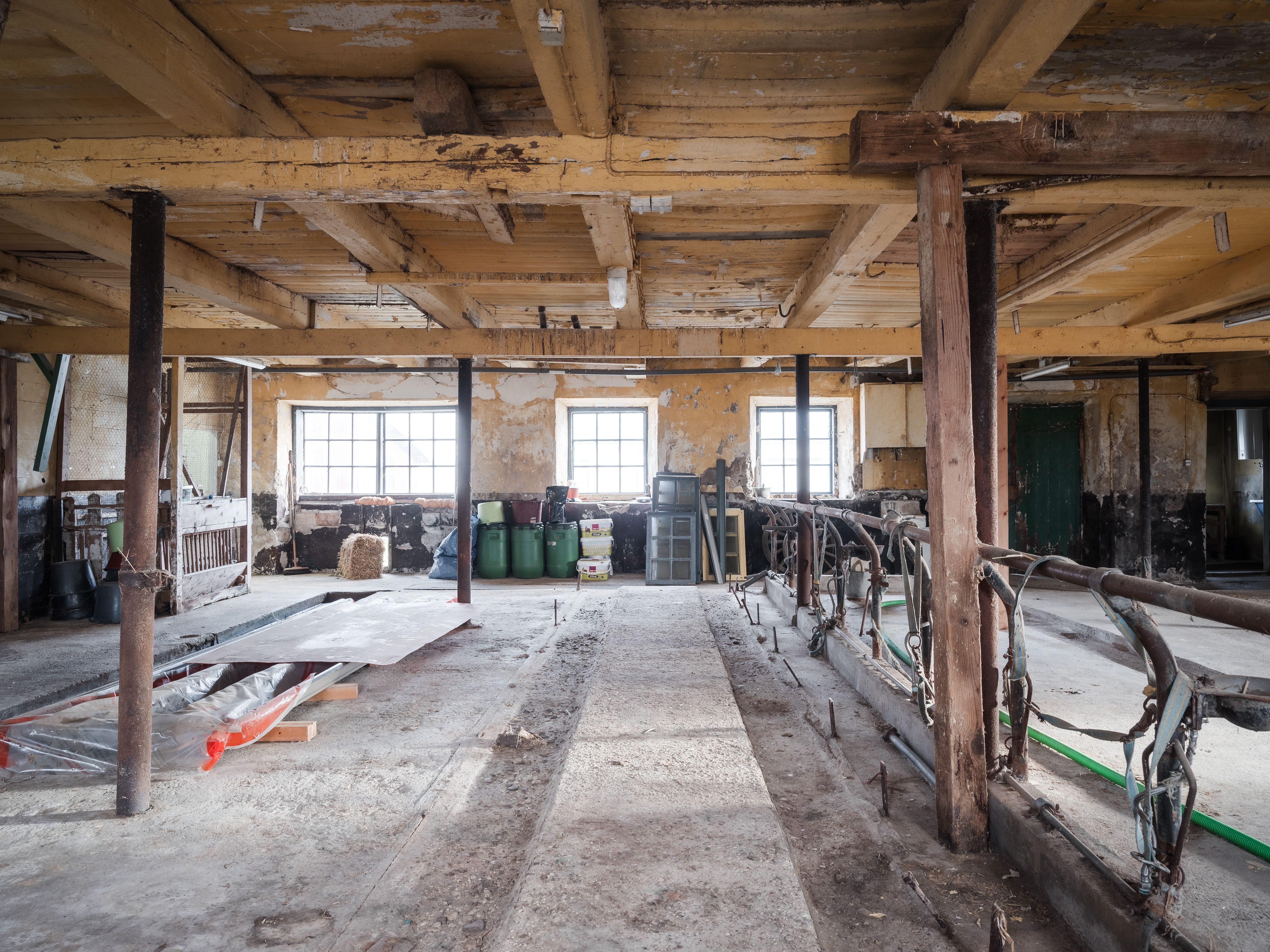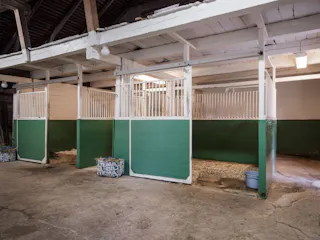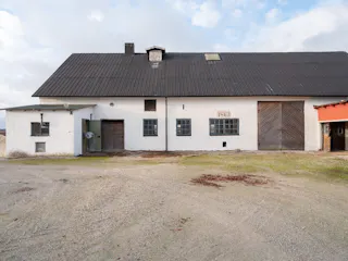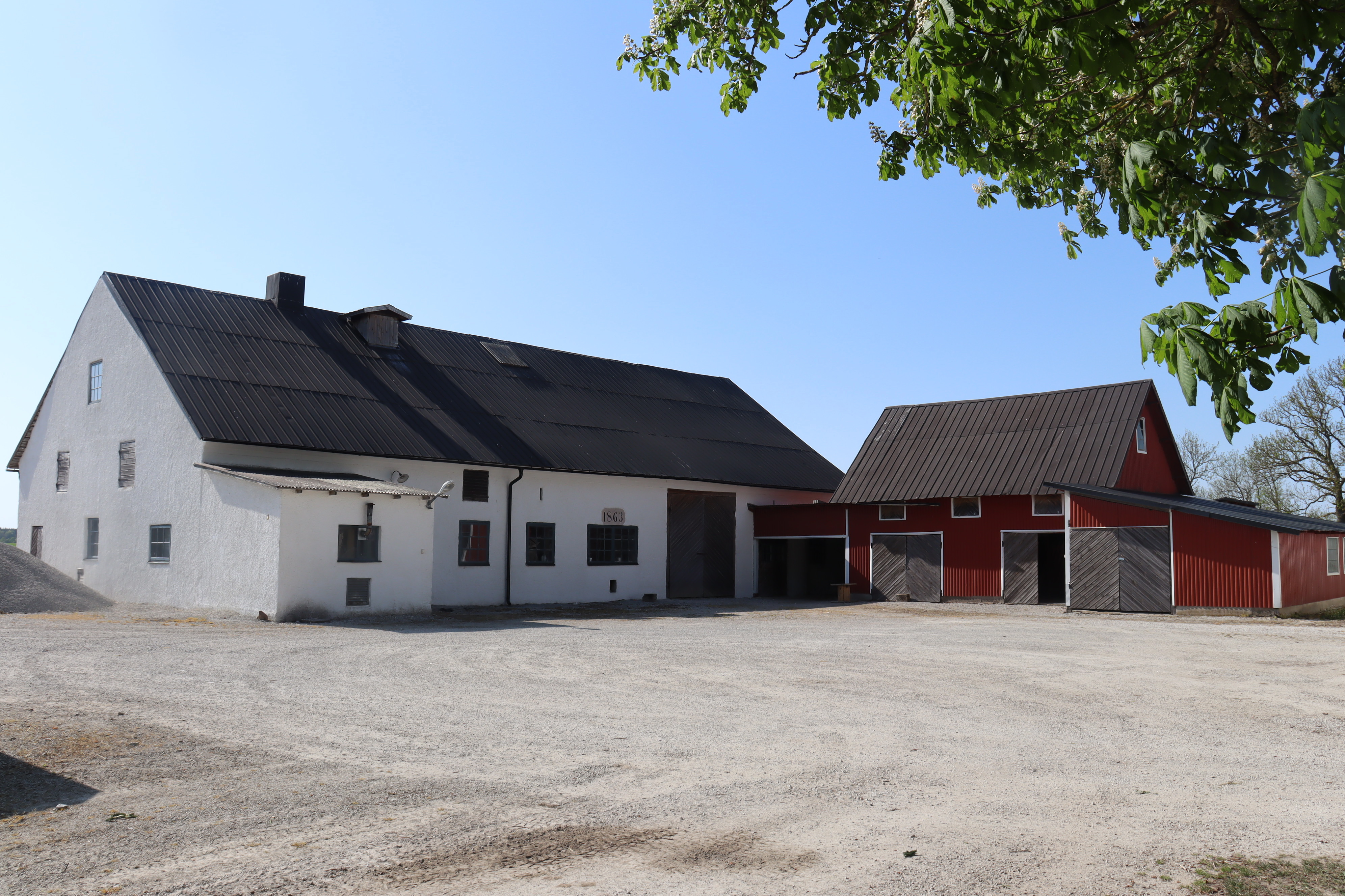 Stenbyggnad under tak av plåt. Byggnadsyta om 489 m² enligt försäkringsbrev. Sannolikt byggt år 1863. Stall med fyra boxar. Tre har använts till hästar och den fjärde som sadelkammare/förråd utan boxdörr. F d mjölkrum/förråd idag. Lada med genomkörsel. Loft ovanför, golvet behöver delvis ses över. Förvaringsutrymmen där det tidigare var djurhållning. Det huserade kor i byggnaden till omkring år 1990 och därefter ungdjur till omkring år 1995. Intill finns carport, förråd samt virkesförråd. Utestall/vindskydd bakom i hagen.