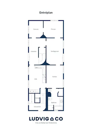 Finentré/hall med parkettgolv och trappa till övervåningen. Sovrum med plastmatta på golvet. Finrum med parkettgolv. Vardagsrum med parkettgolv och utgång till trädgården på baksidan. Kontor med parkettgolv. Badrum i kakel/klinker renoverat -97 (nyare golv omkring 10 år). Vattenburen golvvärme samt även eluppvärmning i golvet så att man kan välja. Utrustat med dusch, badkar, WC, tvättställ i kommod, handdukstork, tvättmaskin och torktumlare. Kök med plastmatta på golvet. Inbyggnadsugn, inbyggnadsmicro, spishäll, fläkt, diskmaskin samt kyl och frys. Köket är renoverat på 90-talet. Groventré på gaveln med trappa till källare och bottenvåning. Tidigare badrum över källartrappan som numera är förråd.