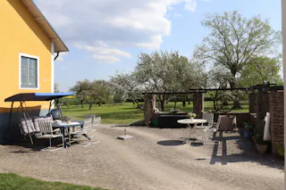 Grusad uteplats på ena gaveln och på den andra gaveln finns en port till förrådsutrymme.