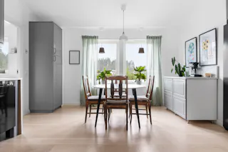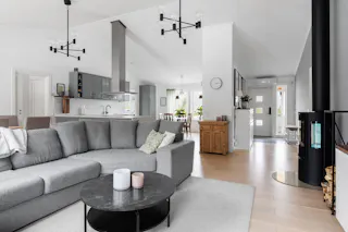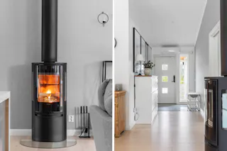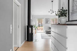 Hemmets hjärta utgörs av den öppna och inbjudande planlösningen mellan kök och vardagsrum. Här skapas en naturlig samlingsplats med braskamin som höjer både mysfaktorn och komforten. Från vardagsrummet nås även altanen, perfekt för sommarens alla stunder.