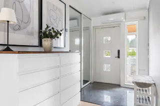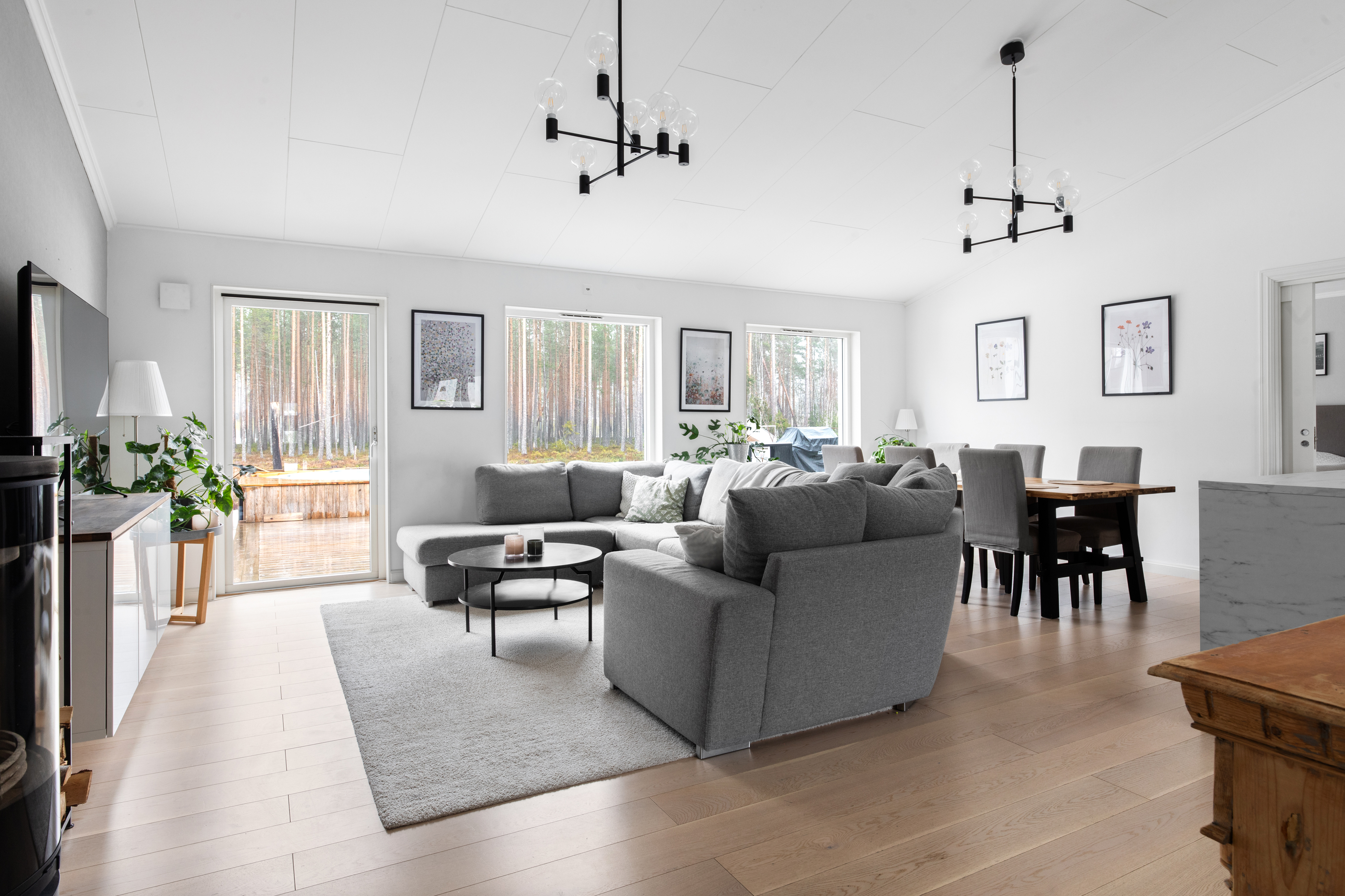 Här erbjuds en stilren och bekväm enplansvilla där det bara är att flytta in och börja njuta av livet. Huset präglas av genomgående hög standard med enhetliga golv och golvvärme i hela bostaden.