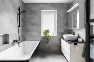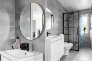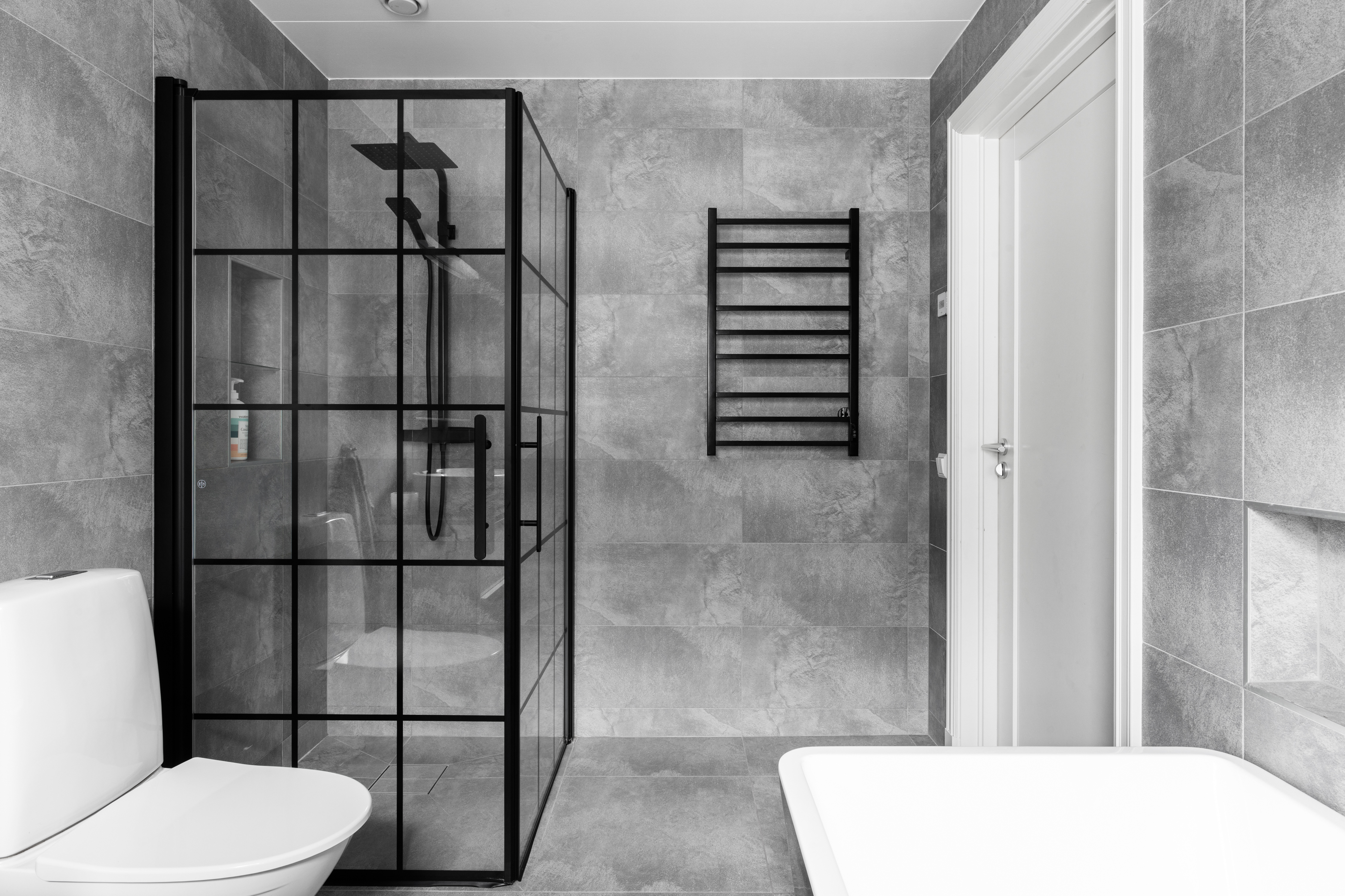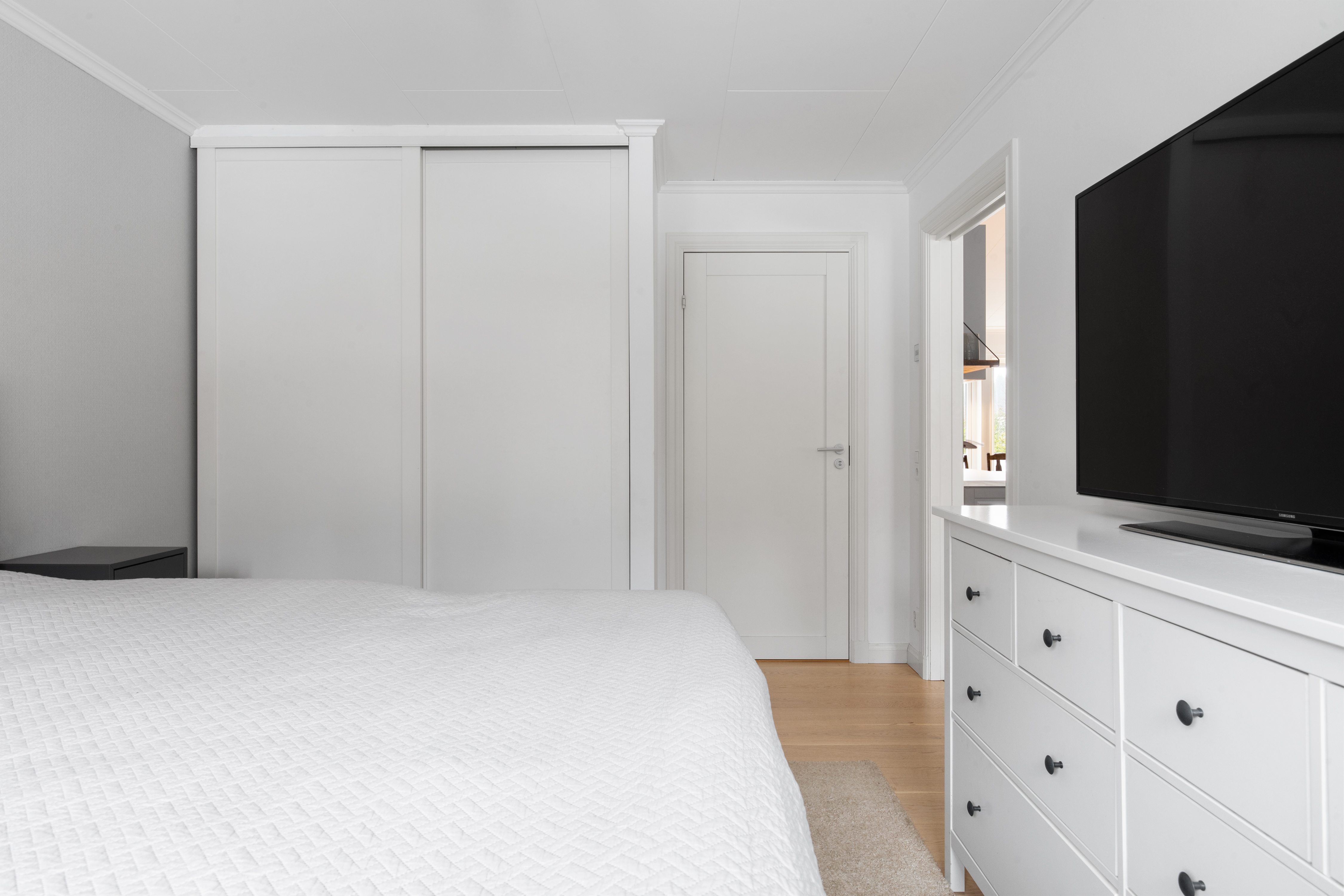 Rymligt sovrum med eget helkaklat badrum med både badkar och dusch samt handdukstork.
