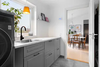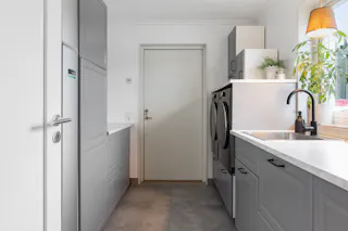 Tvättstuga med groventré. Klinkergolv. Marknadens största tvättmaskin och torktumlare.