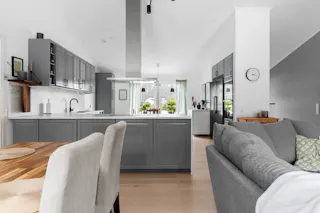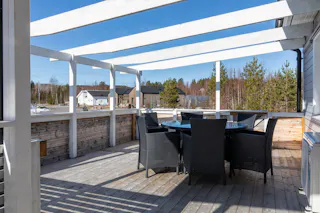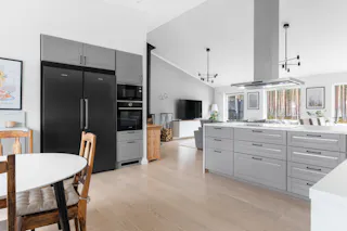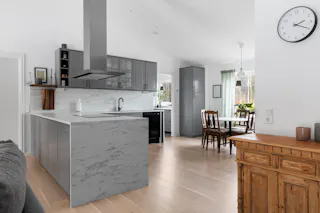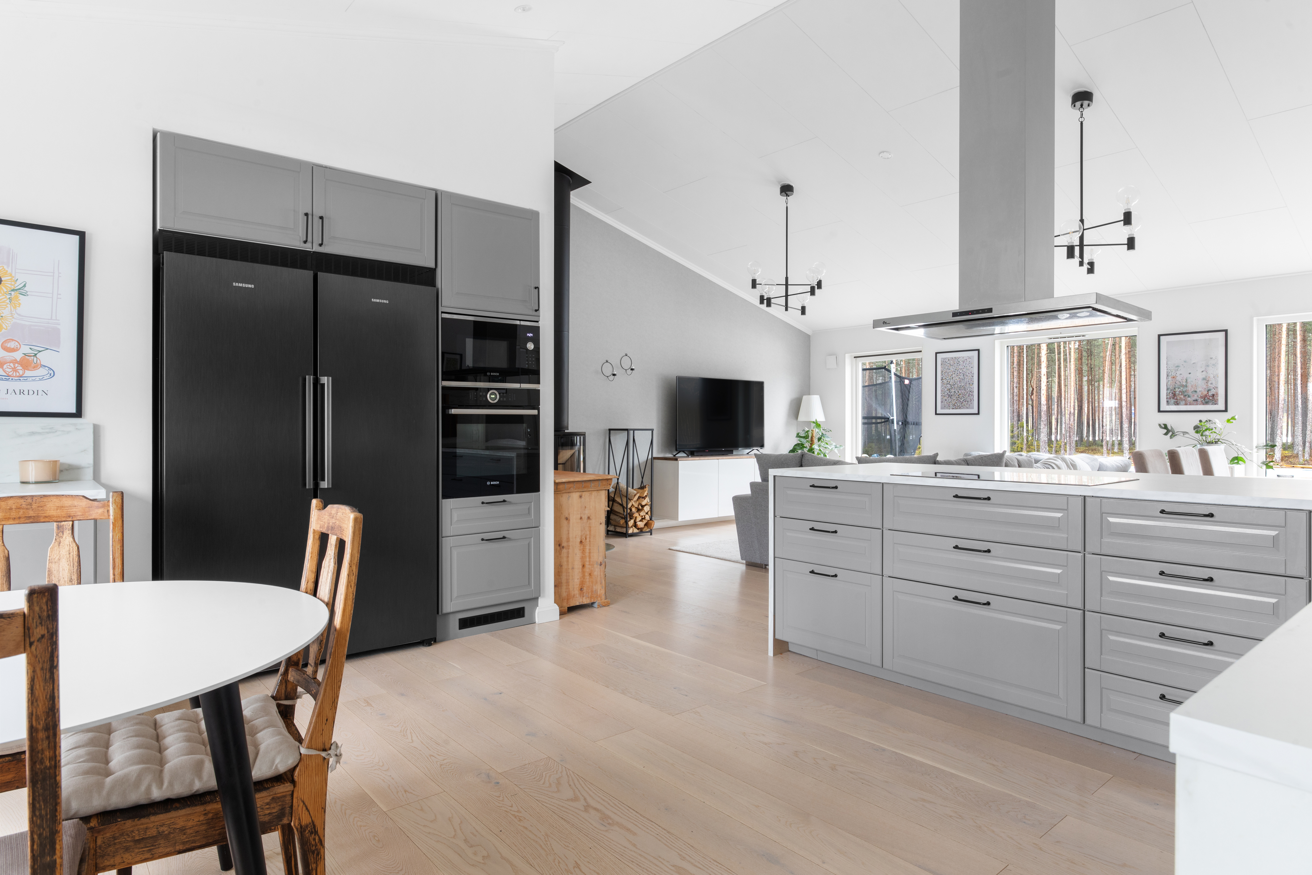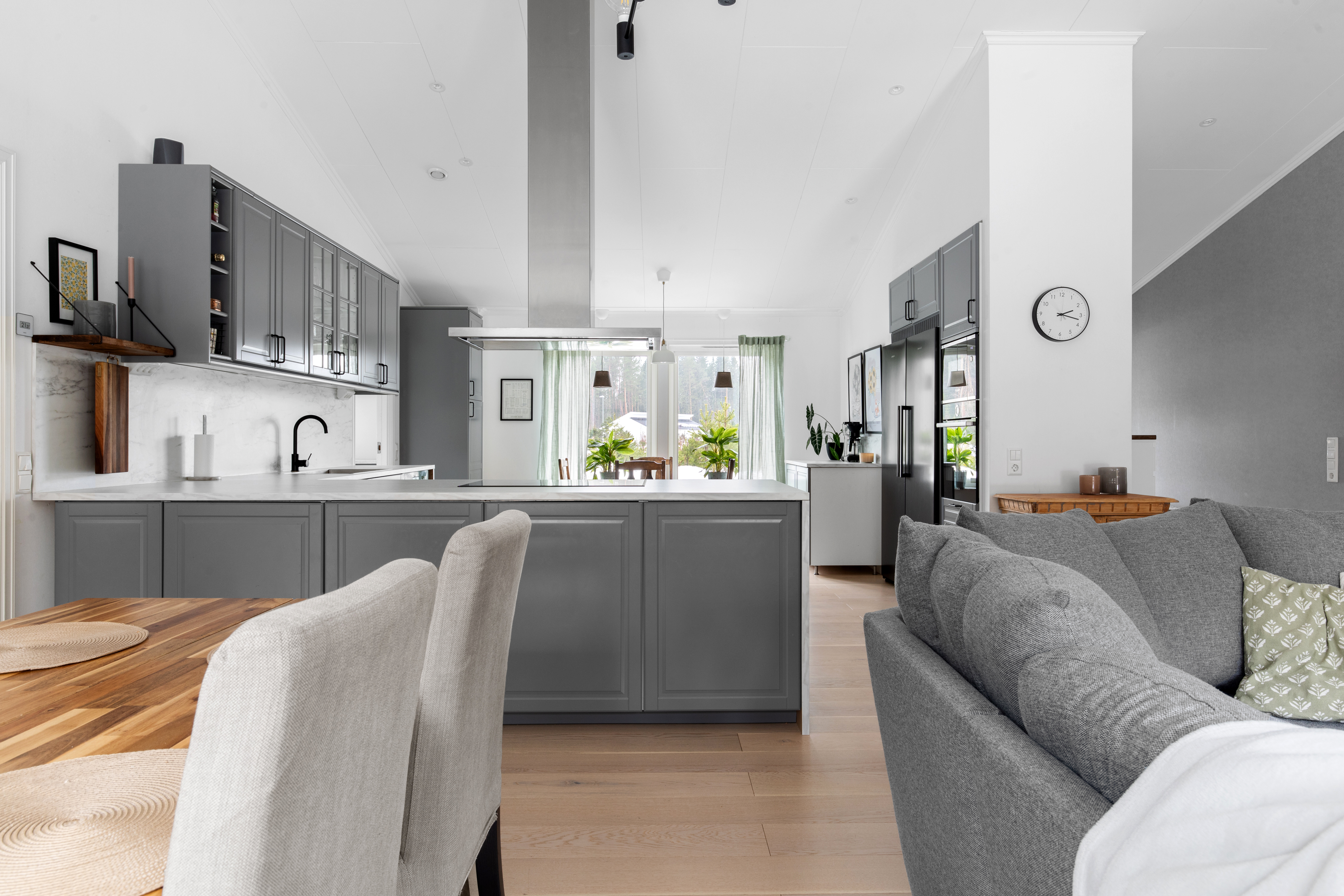 Kök med gråa spårade luckor. Gott om arbetsyta och förvaring med skåp på båda sidor av köksön samt en fristående kaffehörna. Fullstor kyl och frys, inbyggnads micro och ugn. Diskmaskin. Häll med fläkt. Matplats både i köksdel samt plats för både matbord och soffgrupp i rummet. Braskamin. Från vardagsrummet kommer du ut på soldäcket.