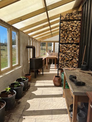 Stort växthus längs långsidan.