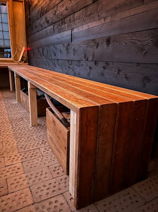 Ladugården innehållande sedanliga utrymmen såsom logdel, fd djurdel, förvaringsutrymmen etc.