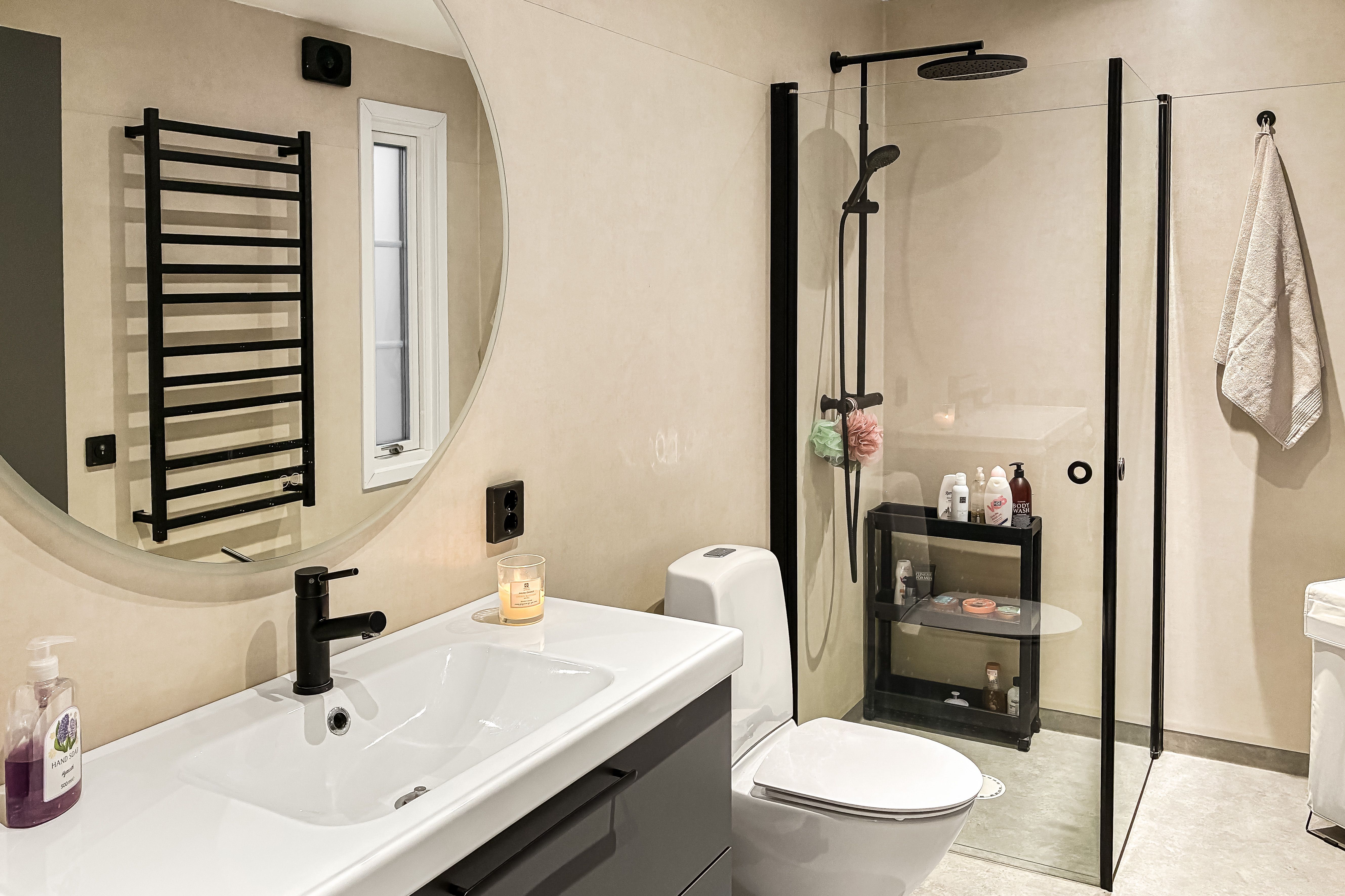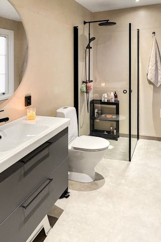 Generöst och modern badrum med wc, handfat och dusch.