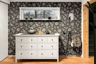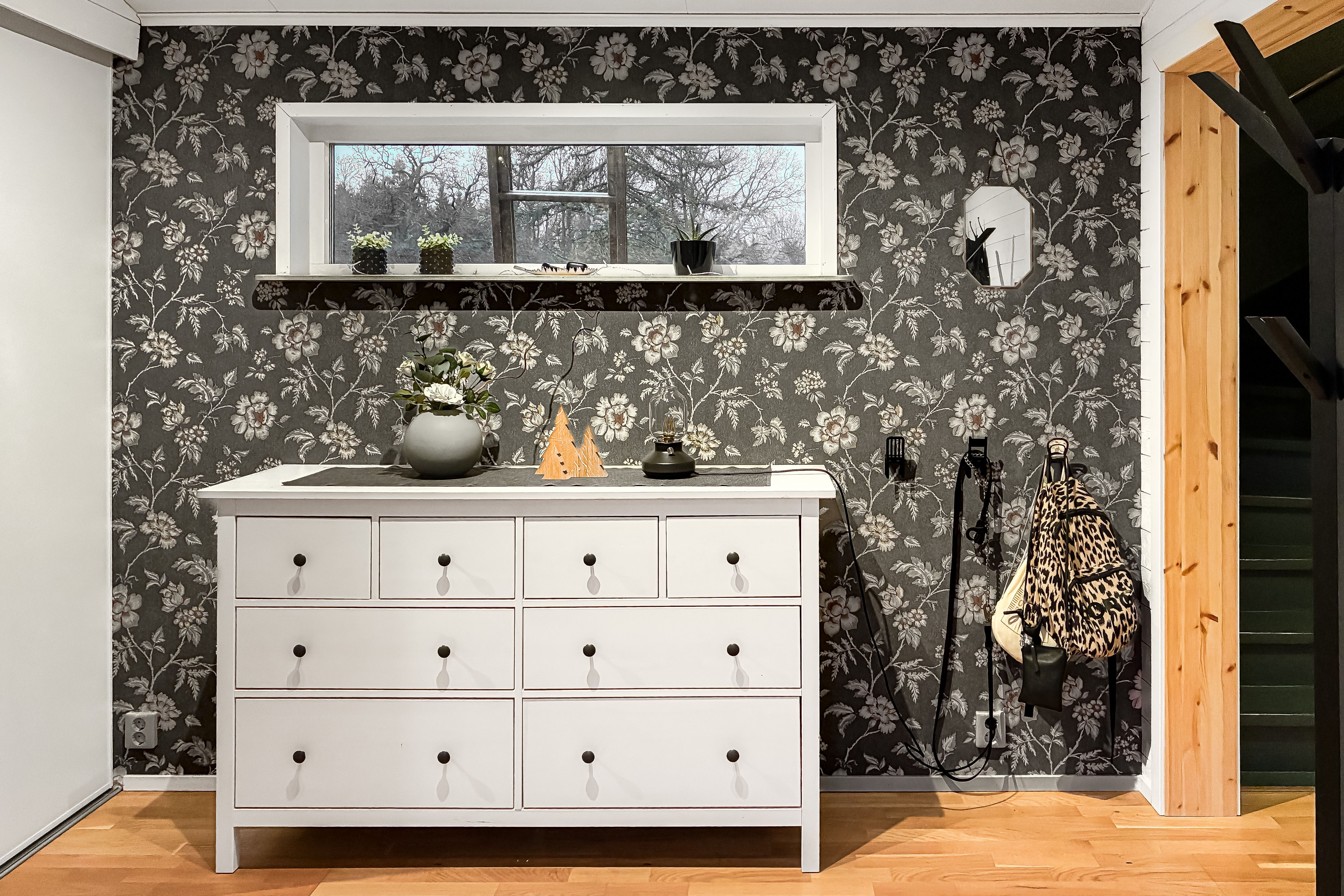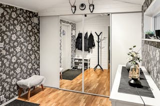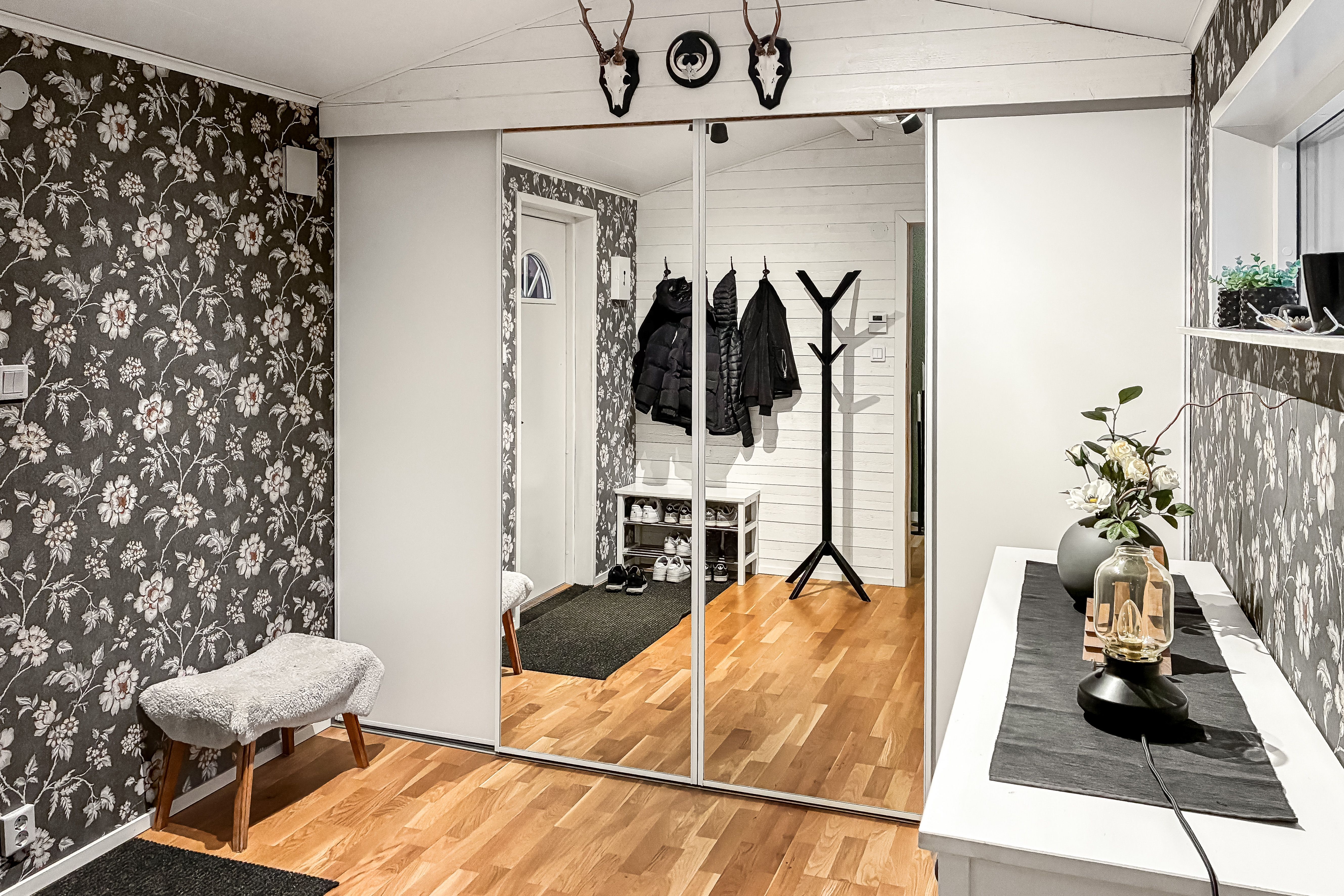 Entré genom välkomnande hall ned utrymme för förvaring.