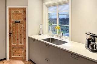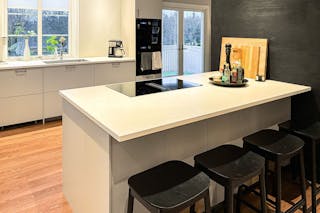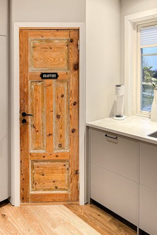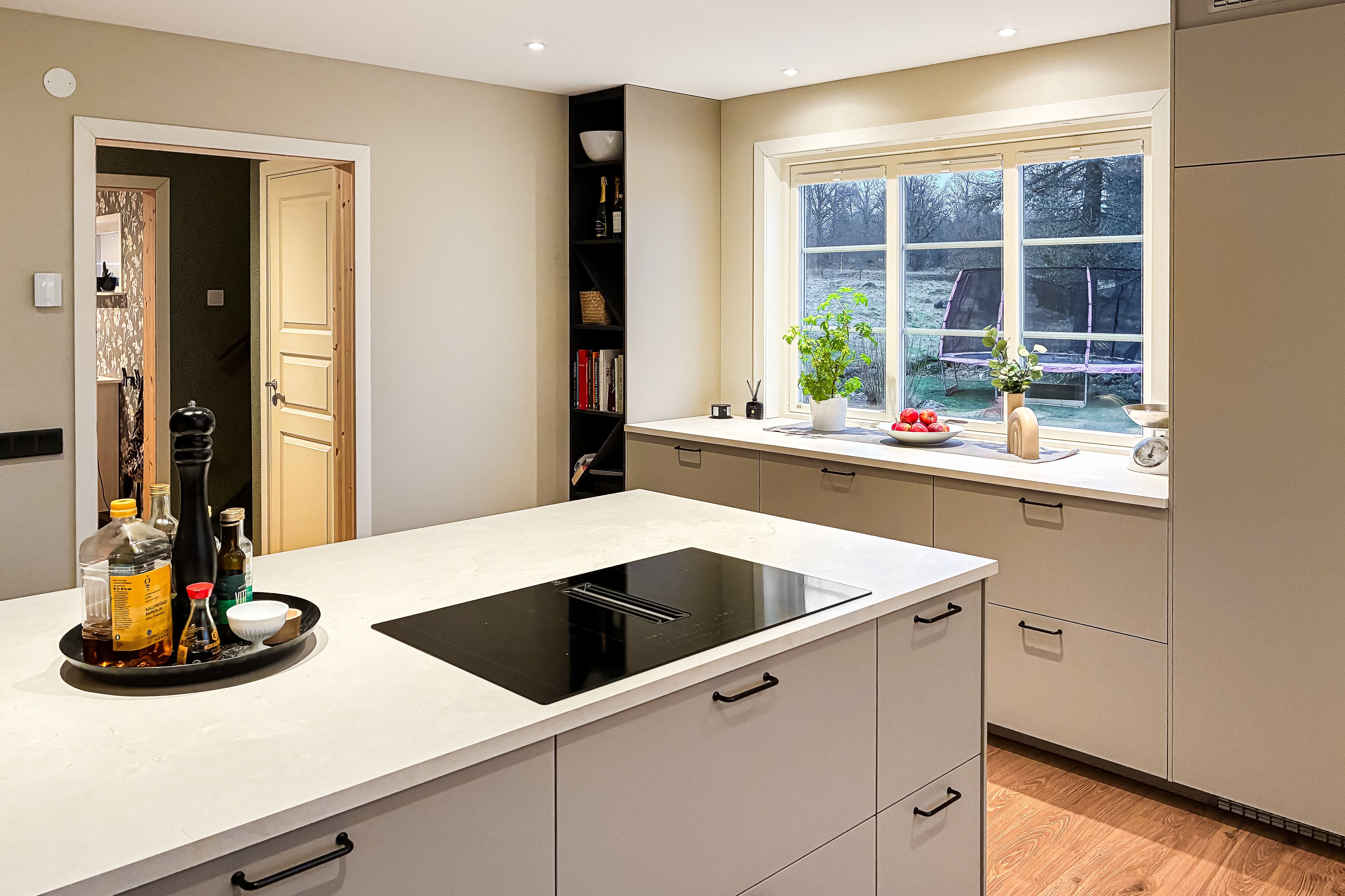 Ljust och öppet kök innehållande bland annat skafferi och köksö.