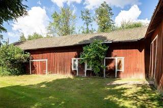 Äldre ladugårdsbyggnad med vedbod, ett vagnslider samt en loge.
