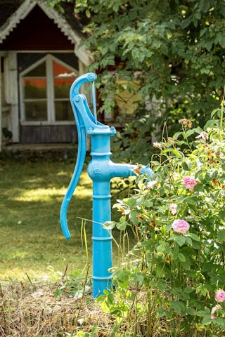 Brunnen borrades på 70-talet med ett djup om ca 50 m. Vatten och avlopp försörjer båda husen.