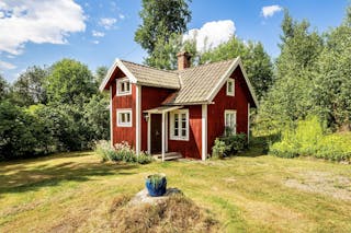 Charmigt äldre litet rött hus med vita knutar.