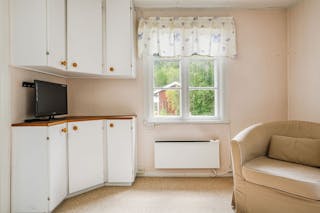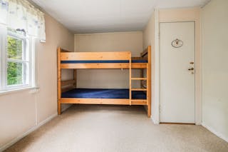 Allrummet har fönster åt två väderstreck samt tillgång till ett intilliggande förråd/klädkammare.