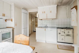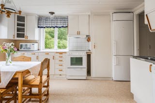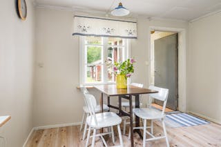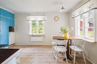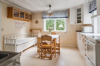 I köket finns det vackra ursprungliga taket med sina rustika plank, idag vitmålat.