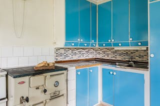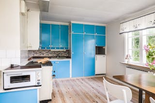 I köket finns plats för ett matbord och köksinredningen går i blått.