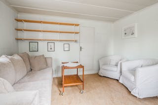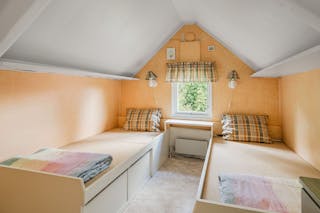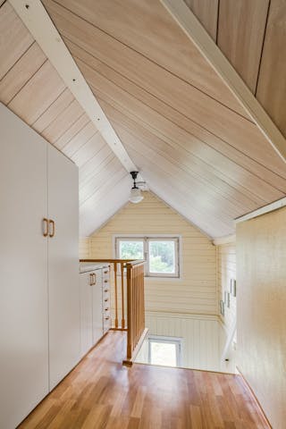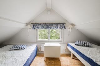 I den övre lilla hallen finns två garderober och en byrå, anpassade efter snedtakens lutning. Här finns även två mindre sovrum under snedtak och med lägre takhöjd. I det ena rummet finns två fasta enkelsängar och i det andra finns plats för ytterligare ett par sängar.