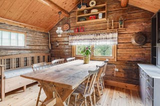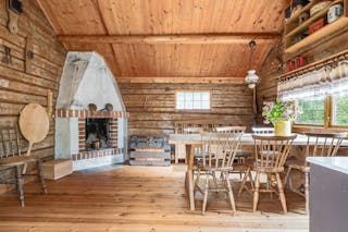 Ingen väggbeklädnad utöver de vackra träväggarna och på golvet ligger ett rustikt plankgolv.