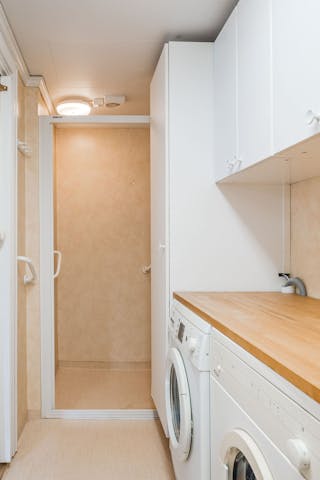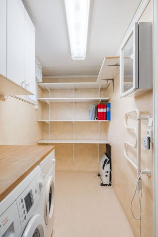 Här finns en tvättmaskin, en torktumlare, förvaringsmöjligheter samt arbetsyta.