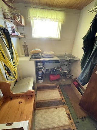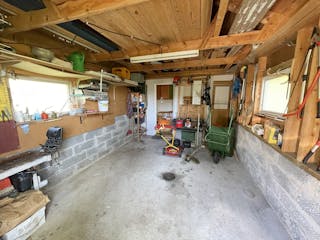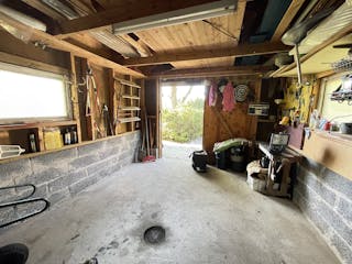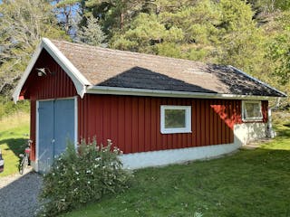 Träbyggnad på gjuten platta, murad grund under betongtegeltak, el och vatten indraget. Inrymmer plats för en bil plus ett isolerat rum/förråd längst in där bl.a vattenpumpen finns.