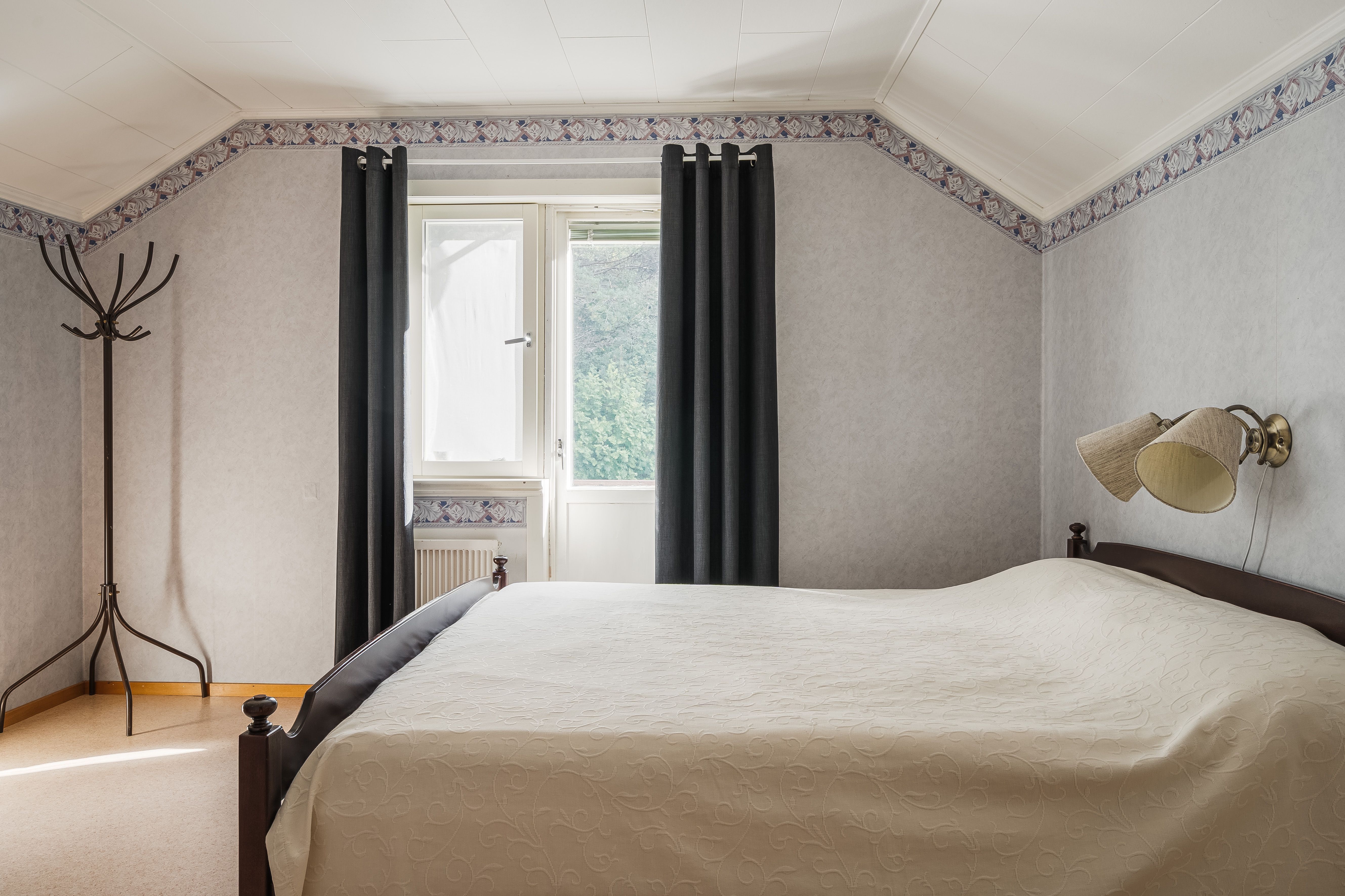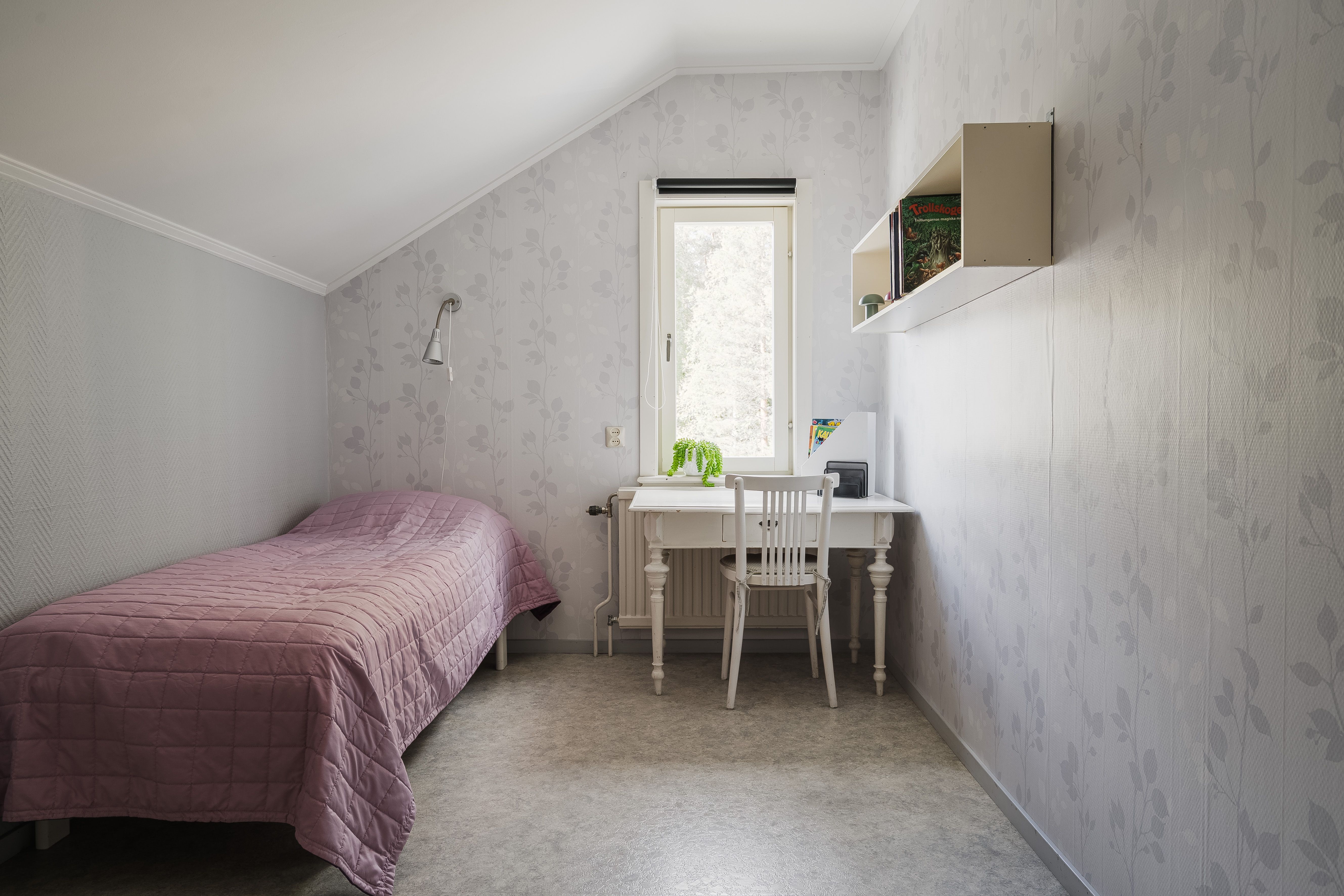 Sovrum 3 med ljus plastmatta, ljus tapet samt praktisk klädkammare. Från detta rum tar man sig till vindsutrymmet.