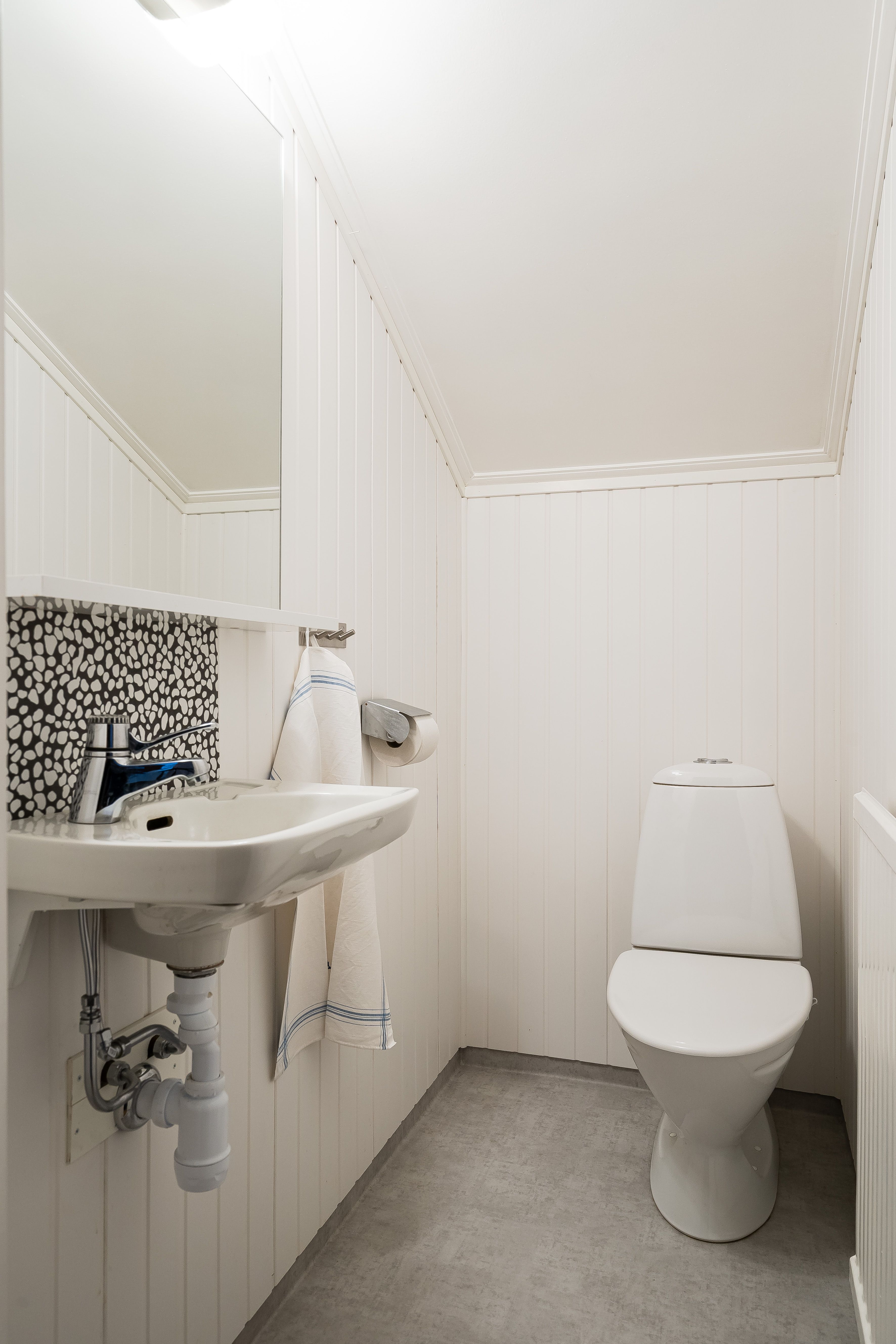 WC med ljus plastmatta, vita panelväggar, wc samt handfat.