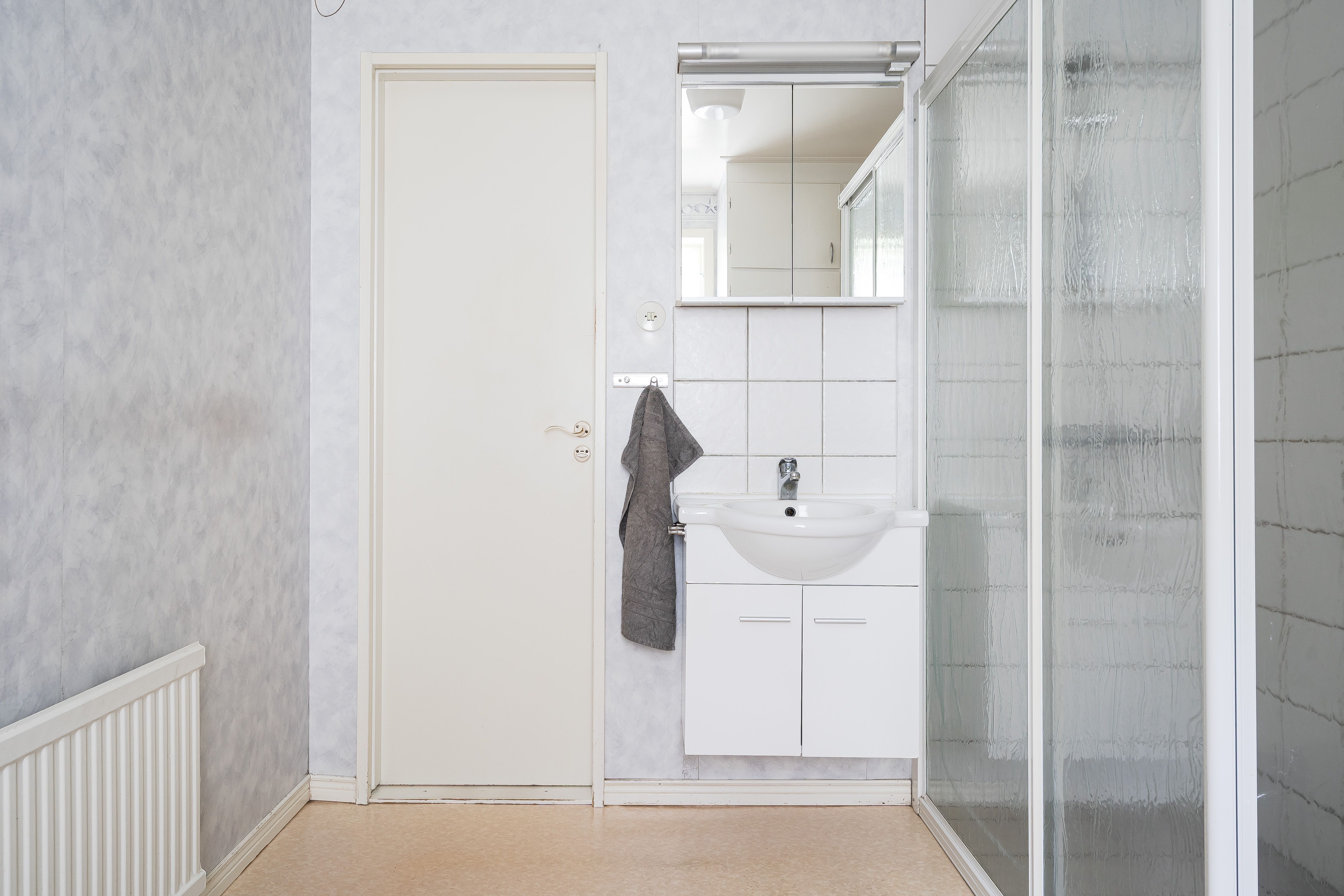 Badrum med våtrumsmatta samt kakel/klinker i duschutrymmet. Wc, handfat med skåp samt duschplats.