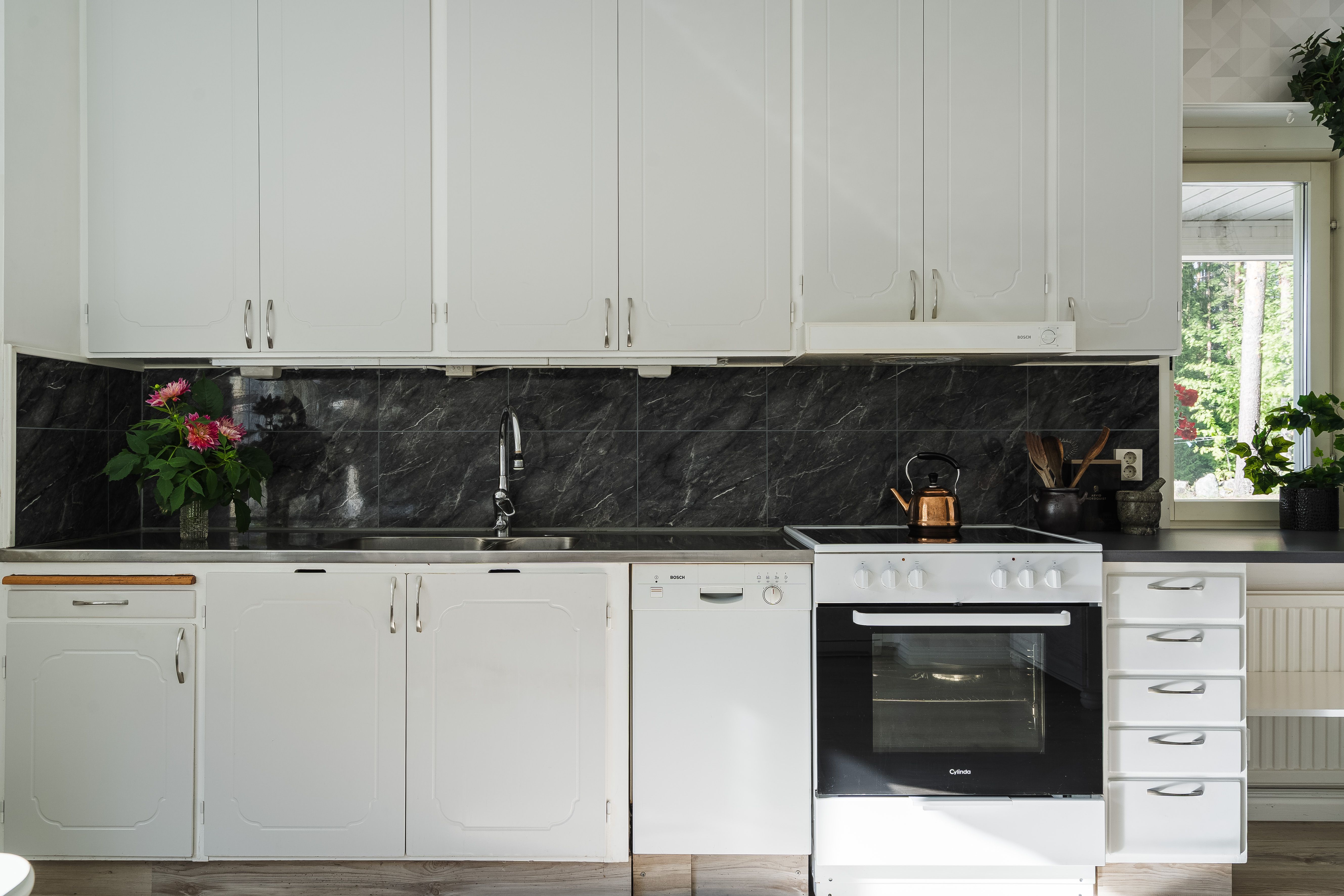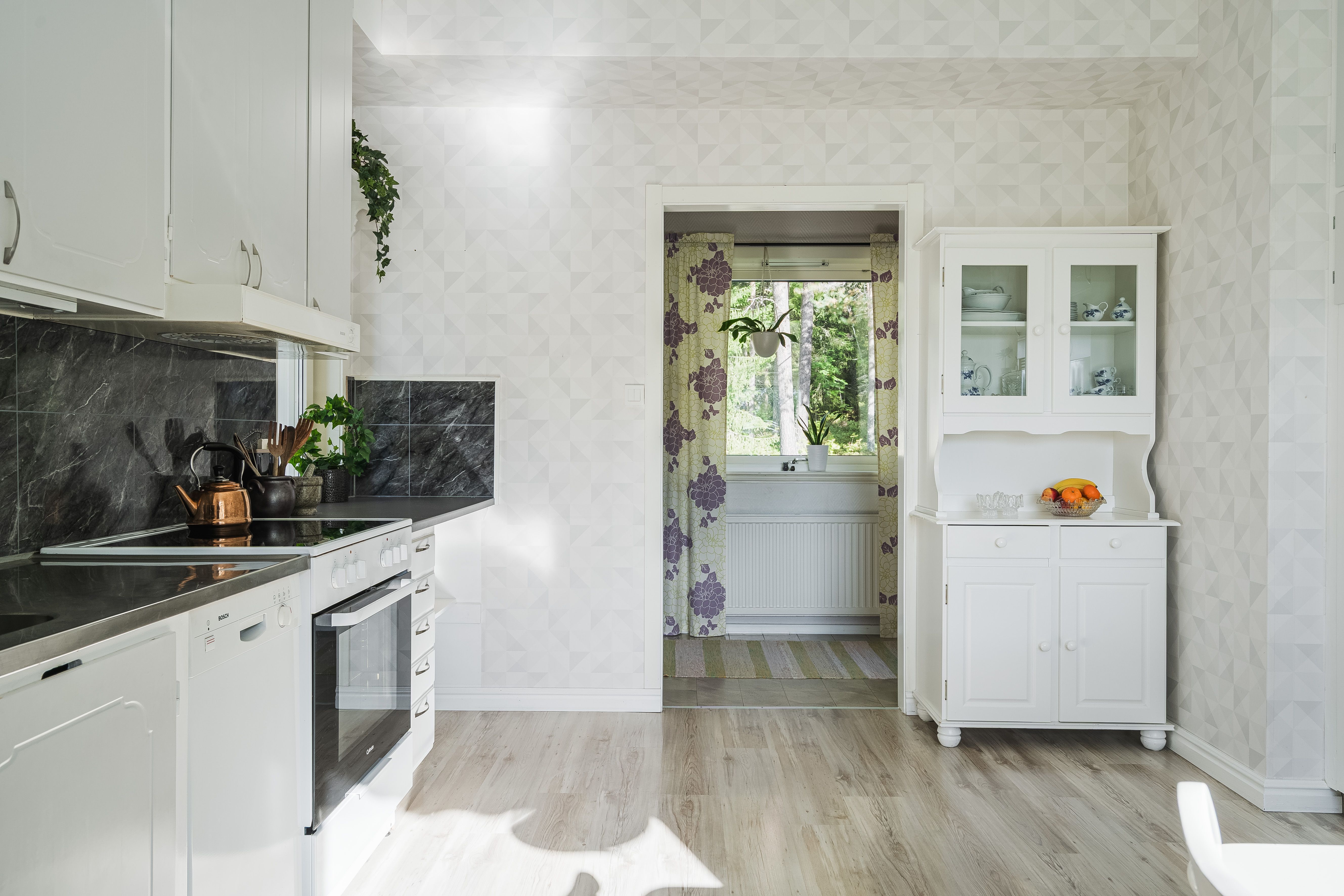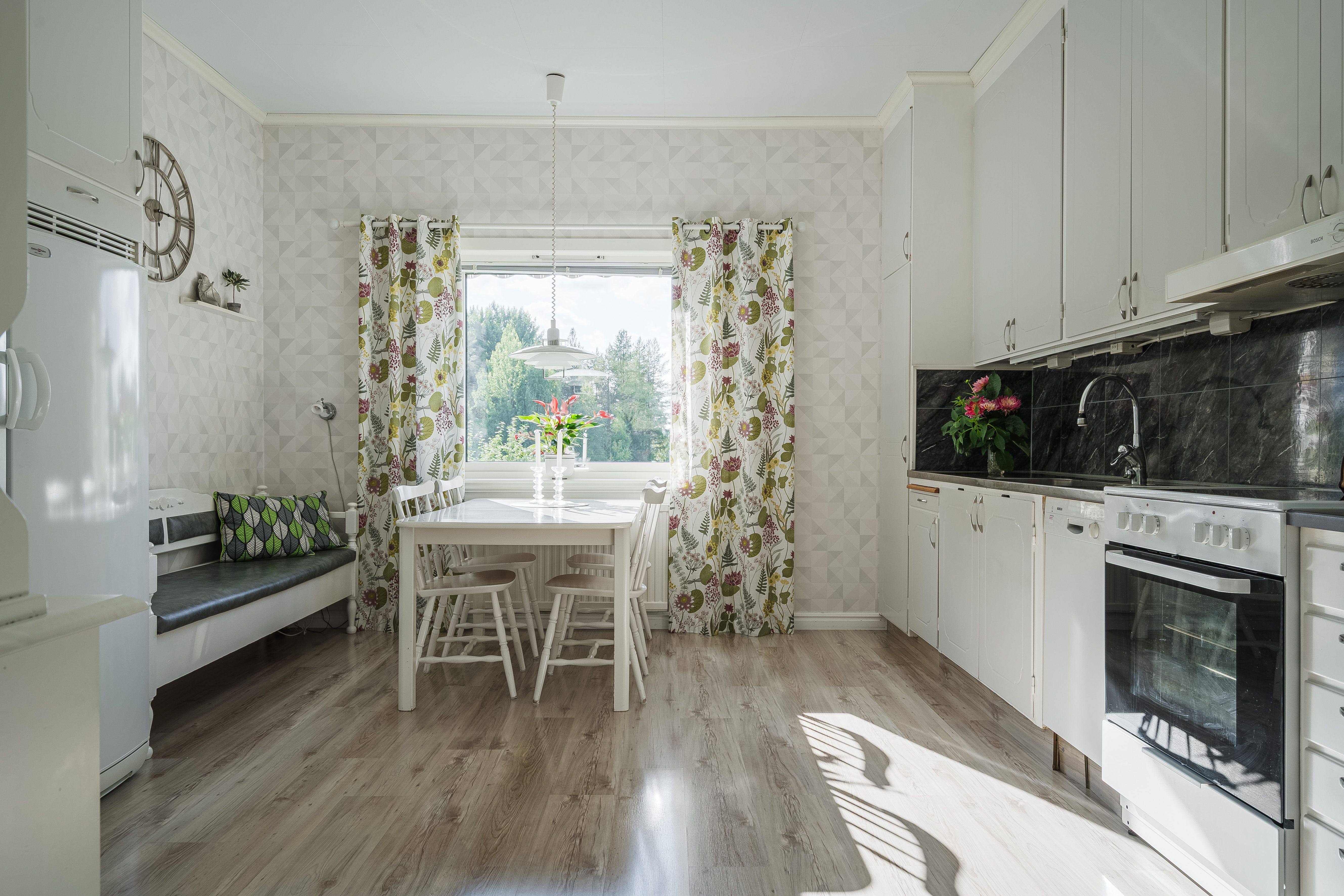 Trevligt kök med rymlig takhöjd, ljusgrått laminatgolv och ljusa väggar. Ljus äldre köksinredning i fint skick med spis, fläkt, diskmaskin samt kyl/frys.