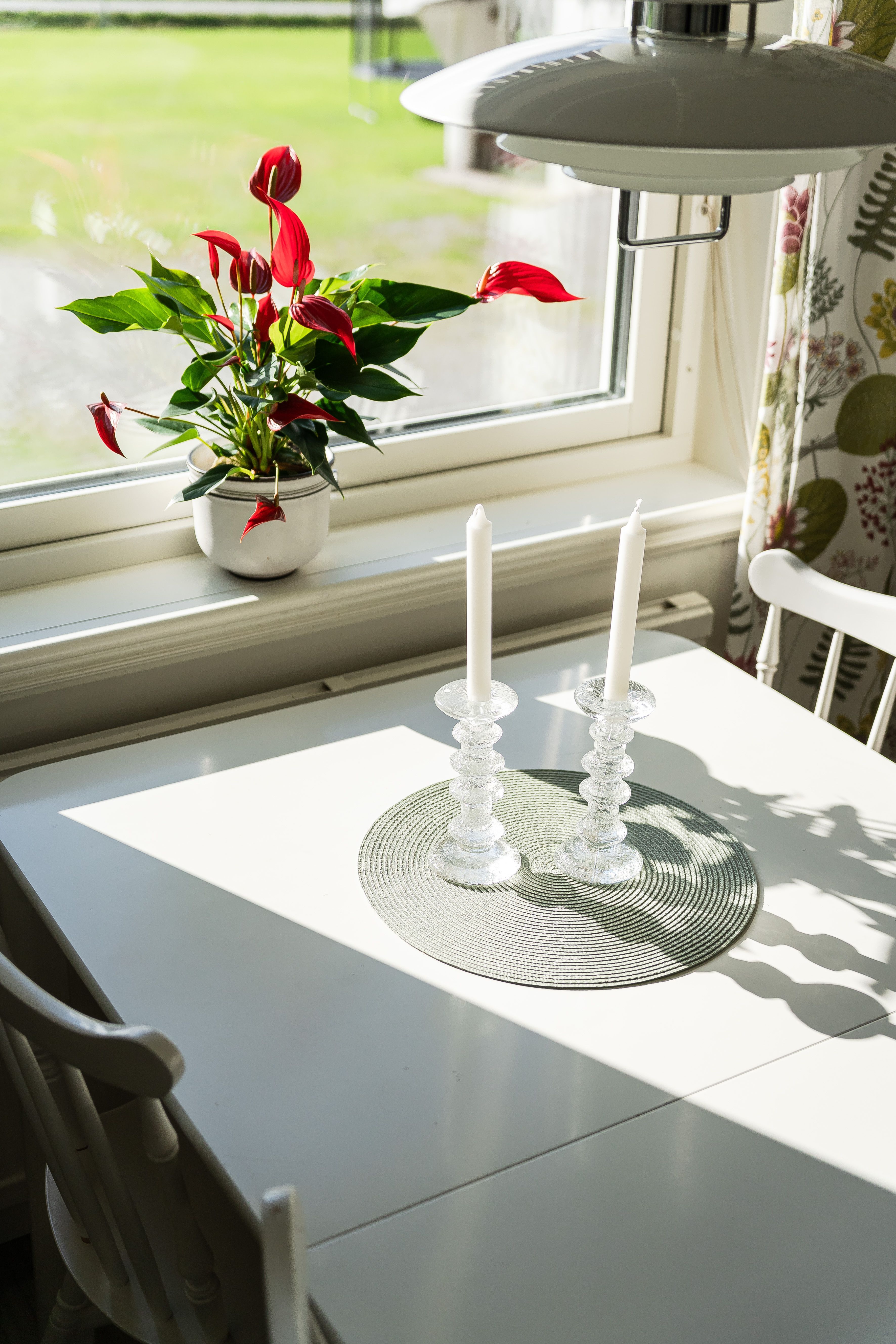 Gillestuga med målat golv, vita panelväggar samt vitt trätak.