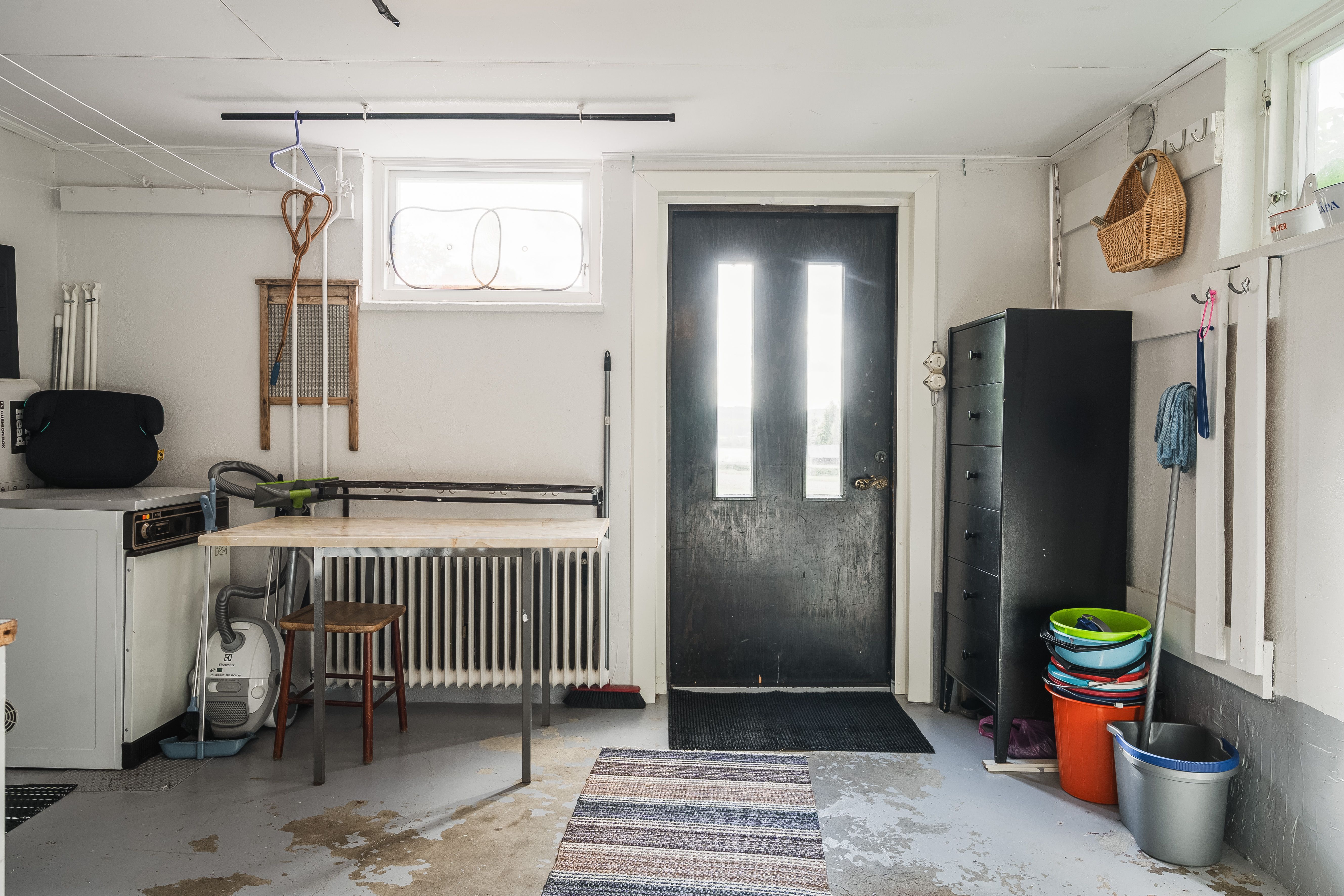 Dubbelgarage med gjuten platta med golvbrunn. Förrådsutrymme samt här finns kram för sommarvatten.