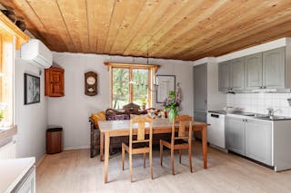 Via den rymliga och möblerbara förstukvisten kommer du in i hallen och vidare in i köket. Här finns gott om plats för ett stort matbord, fönster åt två väderstreck samt en vacker gjutjärnsspis. Vidare når man ett rymligt sovrum med genomgång till vardagsrummet där en värmande braskamin finns.