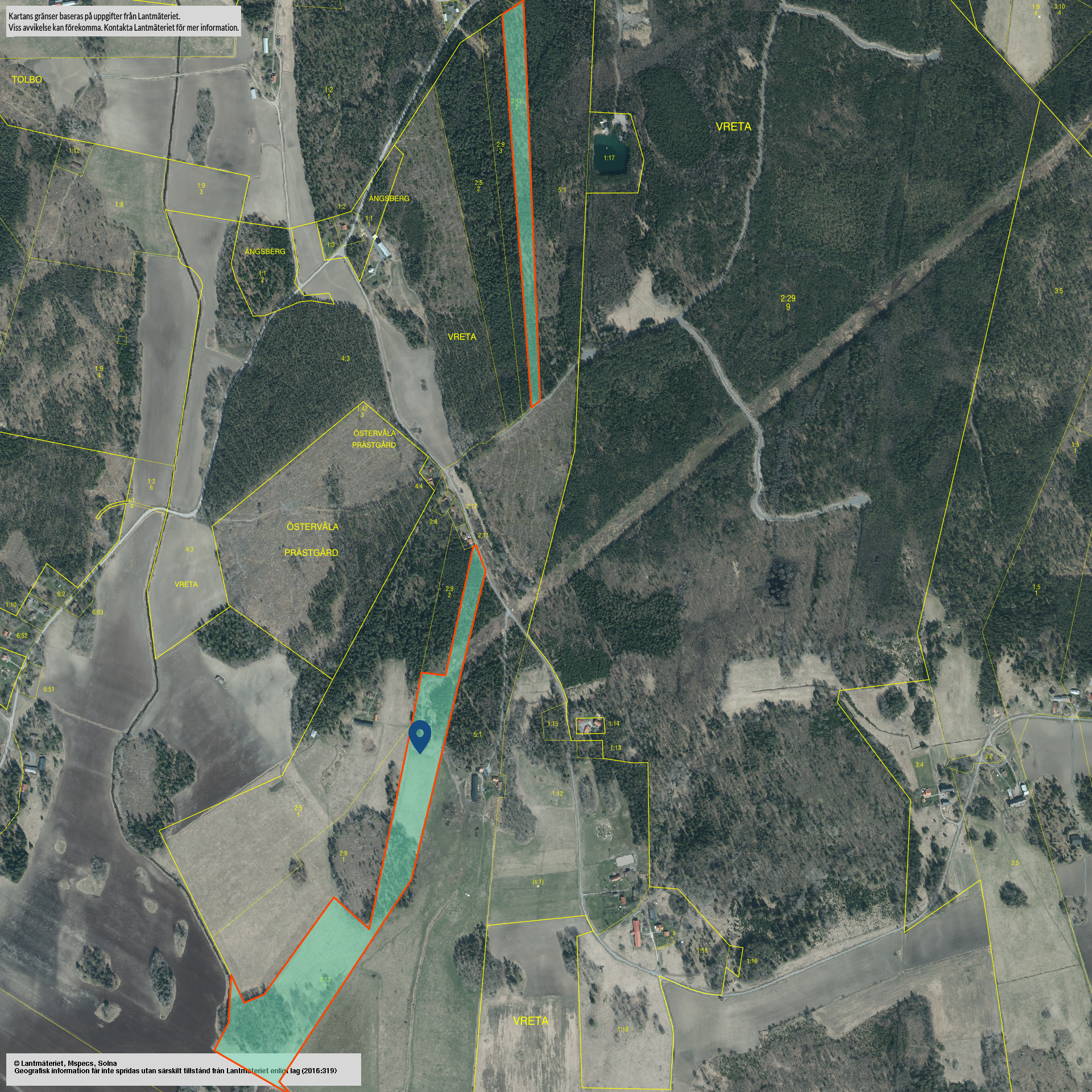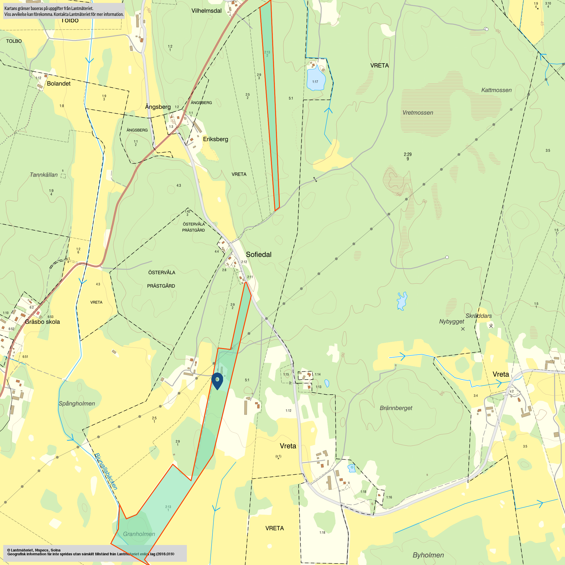 Skogsinventeringen är baserad på taxeringuppgifter, skogstillstånd samt laserscannade uppgifter och kan vara behäftad med osäkerhet i angivna uppgifter. Det kan förekomma avvikelser både uppåt och nedåt. Det kan således inte av köparen uppfattas som någon garanti att uppgifterna korrekt återger fastighetens egenskaper, det åligger köparen att själv kontrollera uppgifterna.